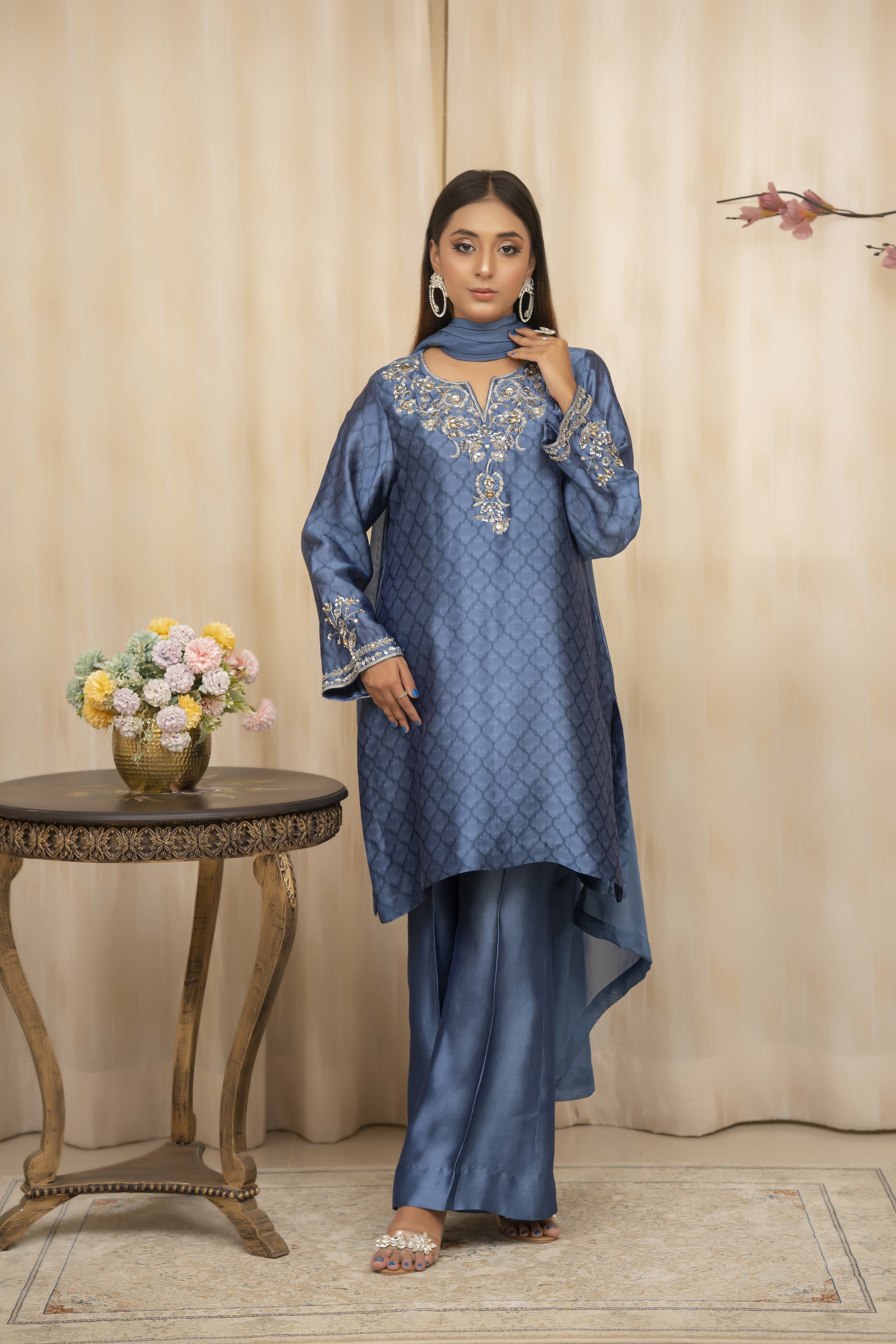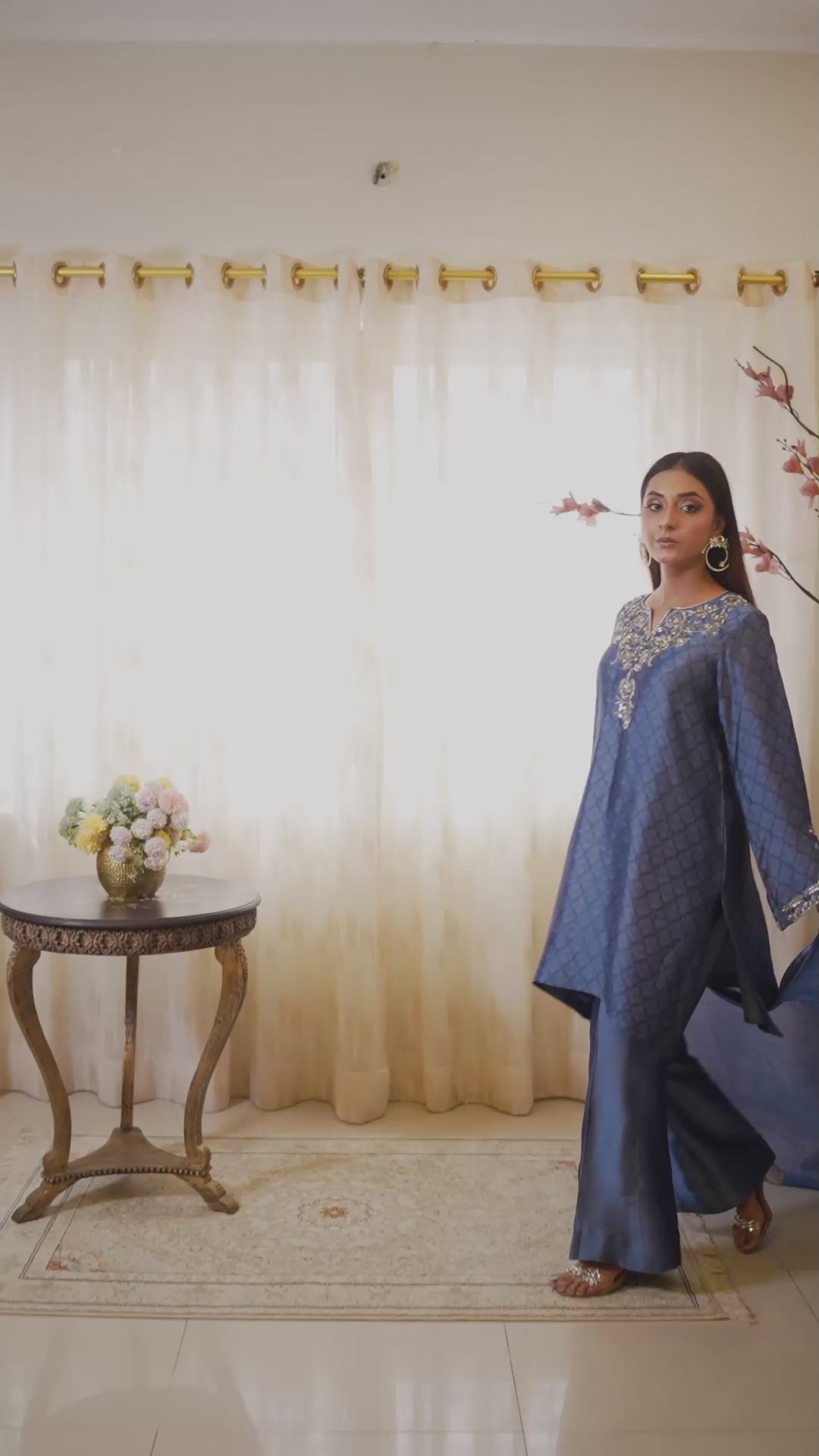 Azm, a co-ord set in a captivating blue shade that embodies the calm and regality in you. Crafted from pure luxurious Sheesha Silk of the finest quality, the shirt and pants drape effortlessly, exuding both grace and sophistication. The self-patterned shirt offers a refined texture, enhanced by exquisite stone and diamonte work. The addition of intricate kora dabka embroidery elevates the co ord set with a traditional touch, while the subtle sequins work detailing adds a shimmering finish.