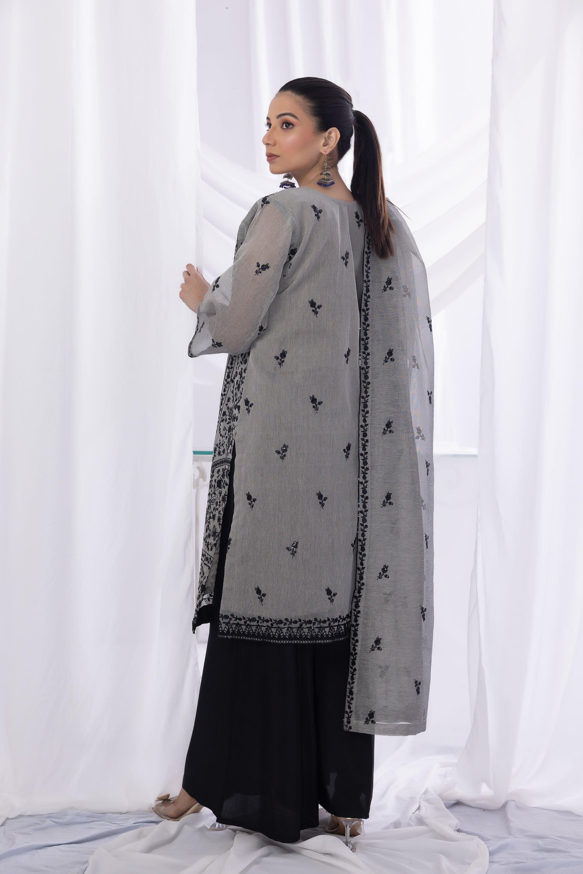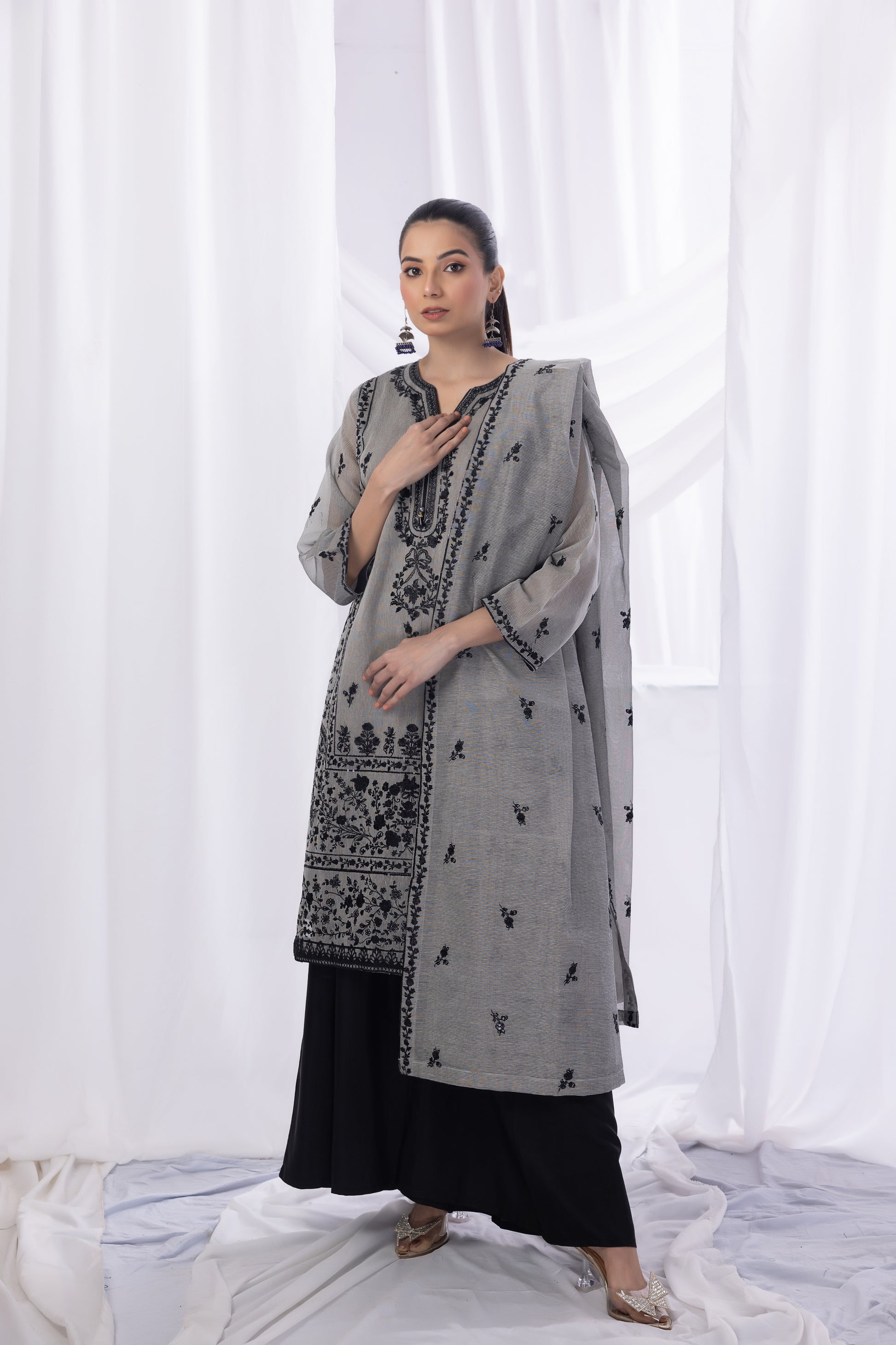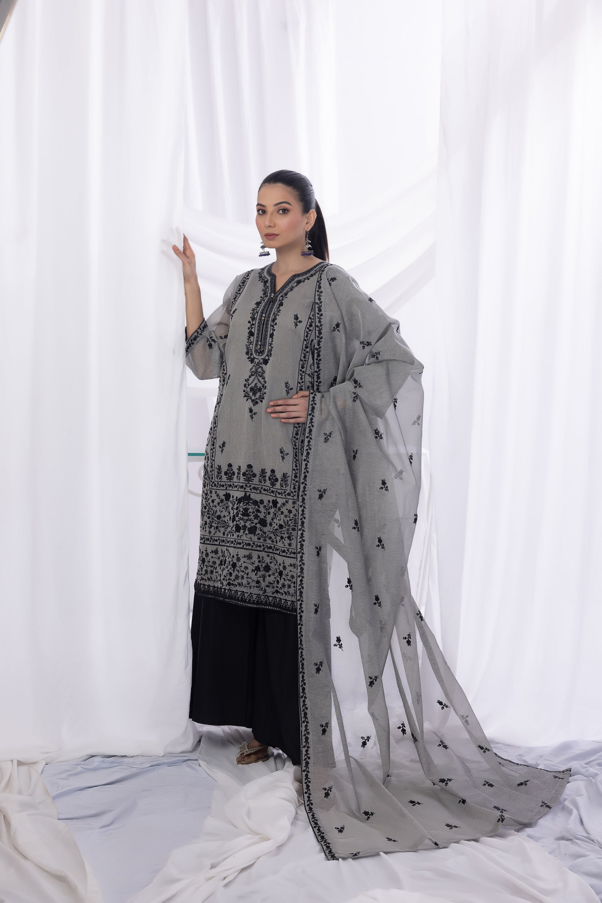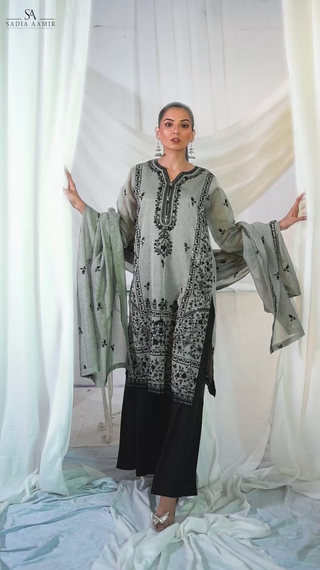Experience the enchanting beauty of Dasht, our Khaddi Net shirt paired with a lovely khaddi net dupatta adorned with exquisite embroidery. Elevate the look with Dhaka Silk pants for a modern touch. Embrace the divine allure of this ensemble!