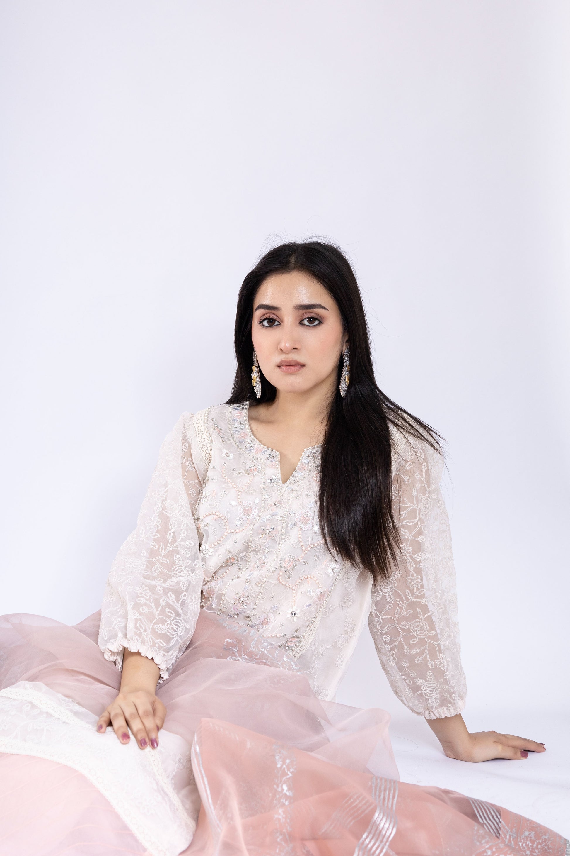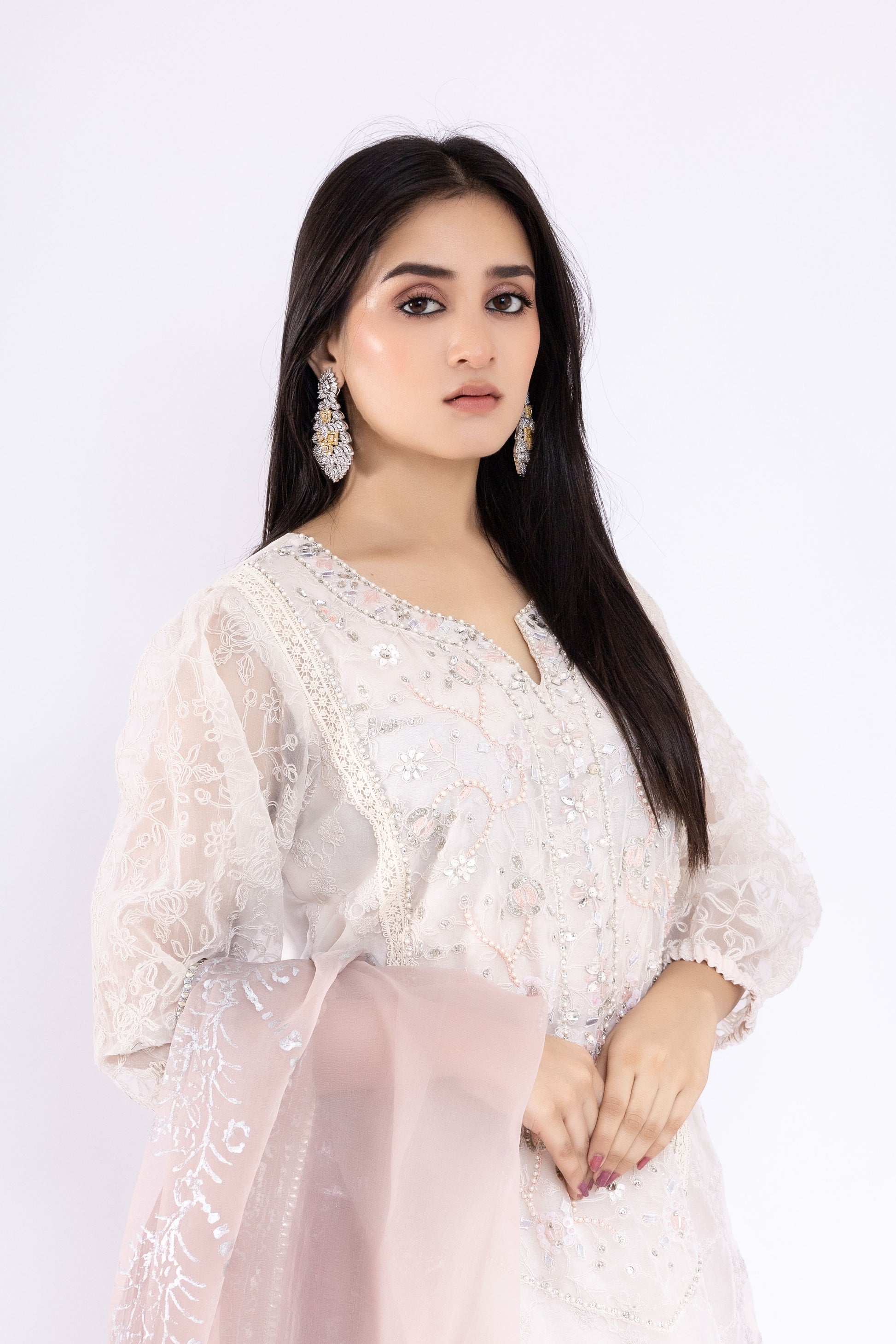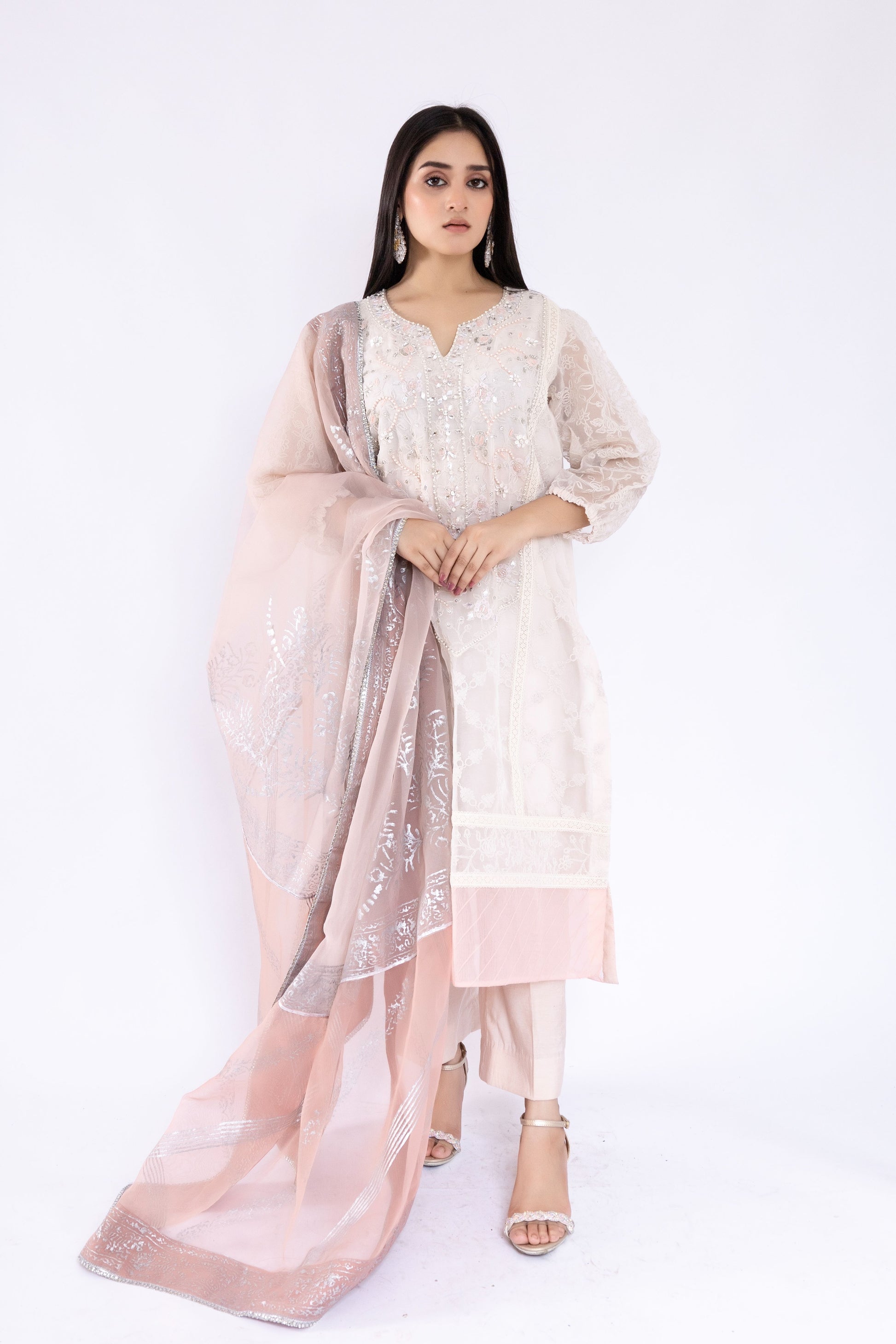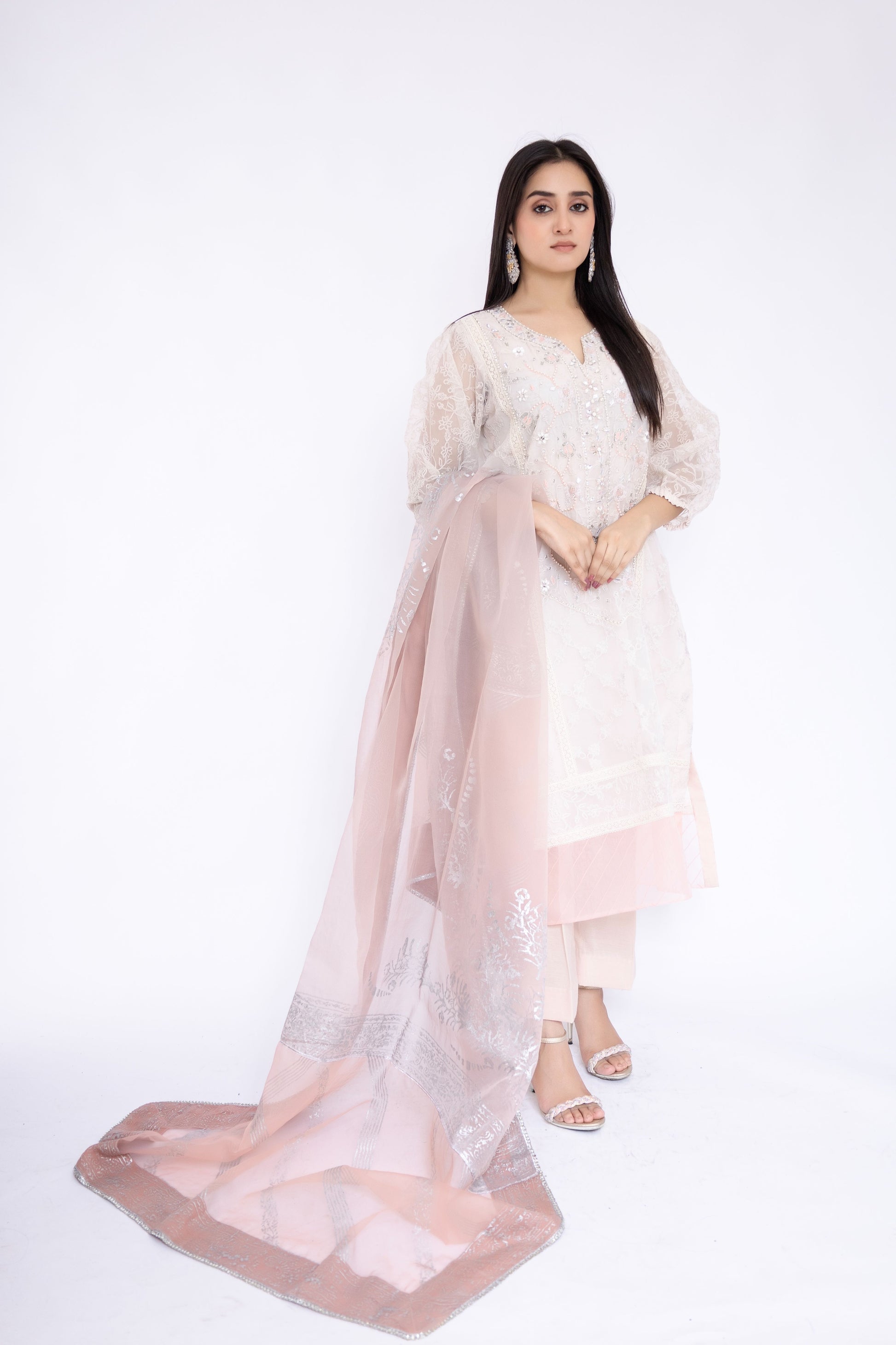 Step into a world of ethereal elegance with Pure Embroidered Organza ensemble, adorned with exquisite zardozi work. Embrace the luxury of Silk Culottes that perfectly complement the enchanting beauty of the outfit. Drape yourself in sheer sophistication with the Organza Dupatta, adorned with mesmerizing block print and delicate lace. Elevate your style to a whole new level of grace and allure!