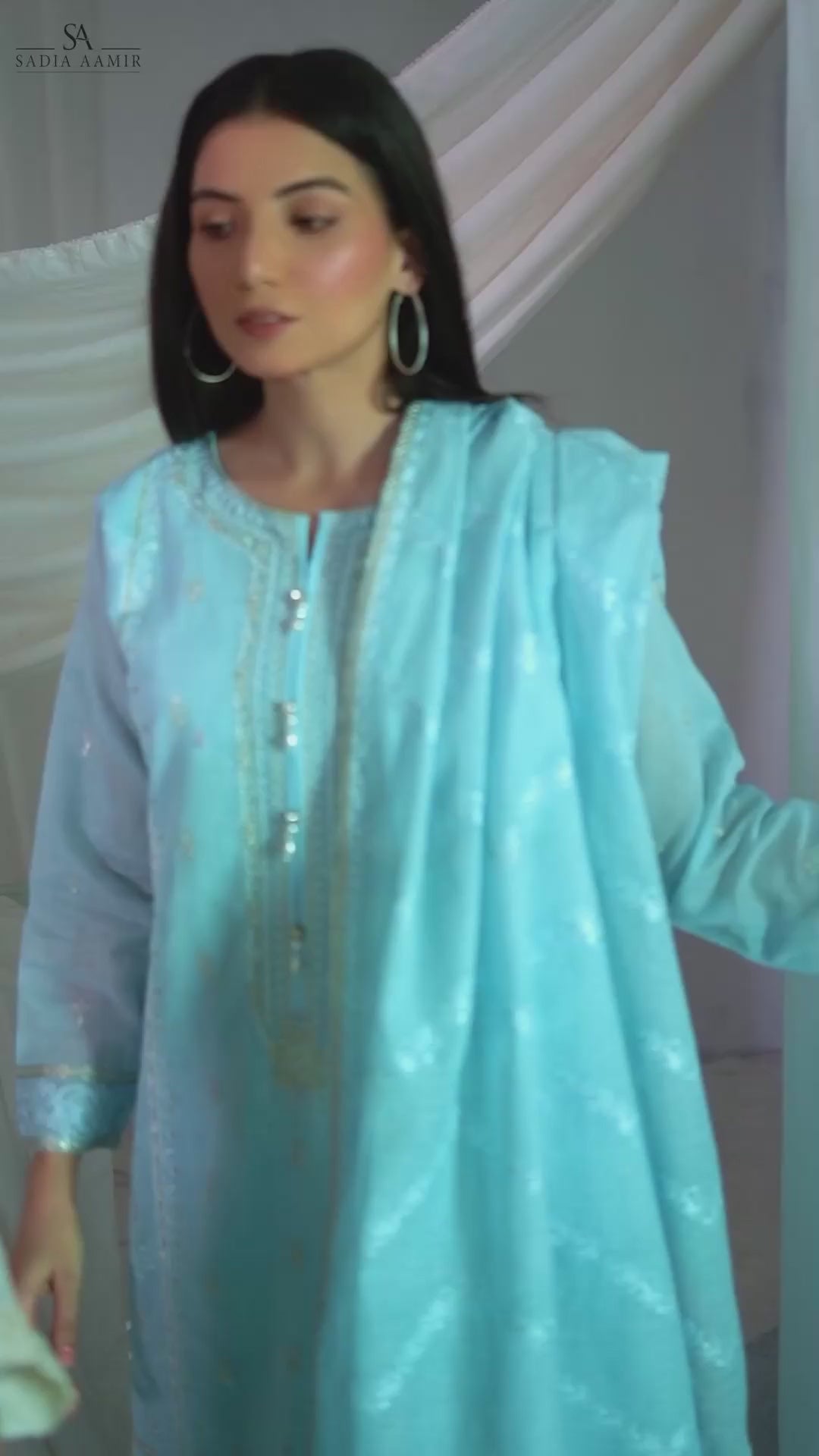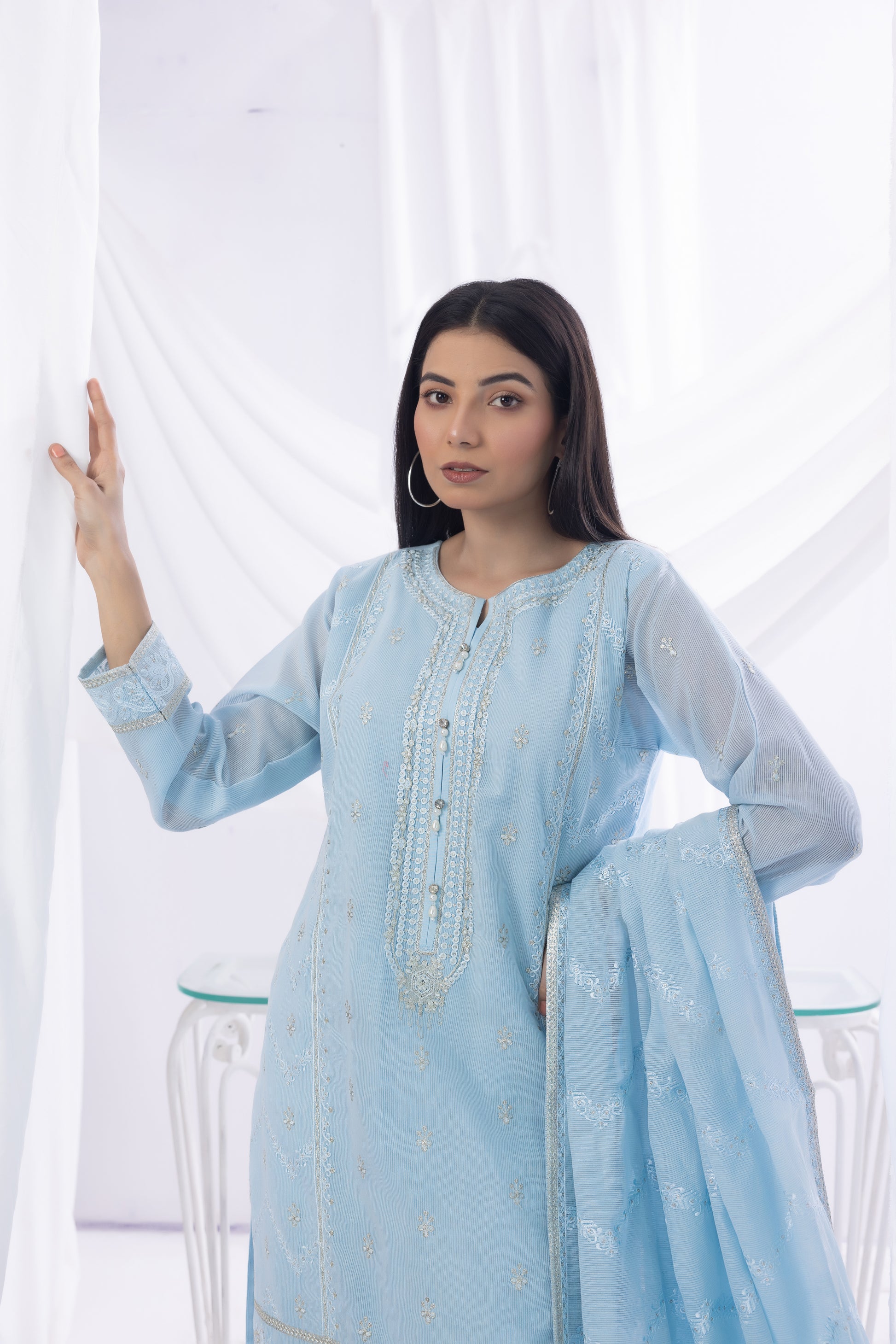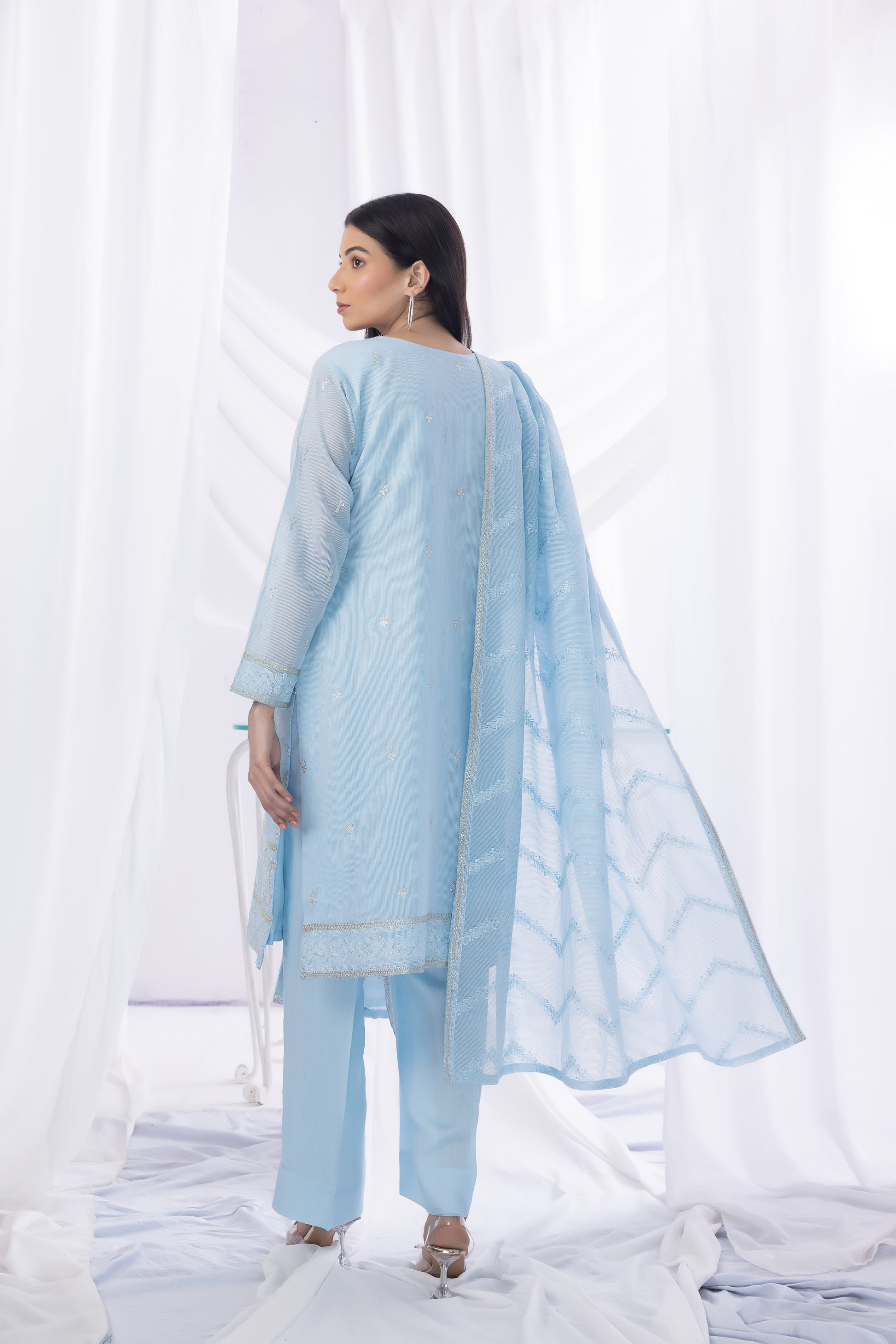 Indulge in the divine allure of this Khaddi Net shirt, Falak. Draped in elegance, khaddi net dupatta boasts beautiful embroidery with detailing. Silk culottes add a fashionable twist, ensuring you radiate sophistication and style.