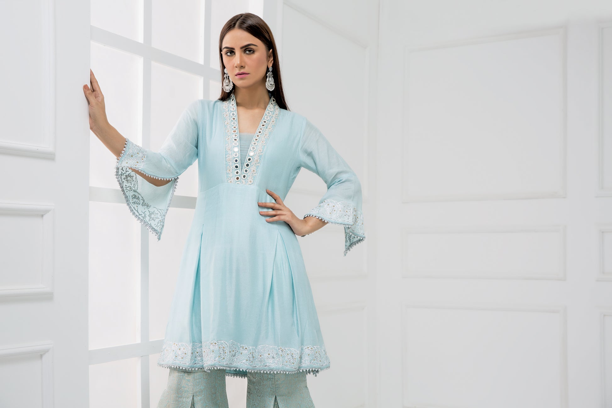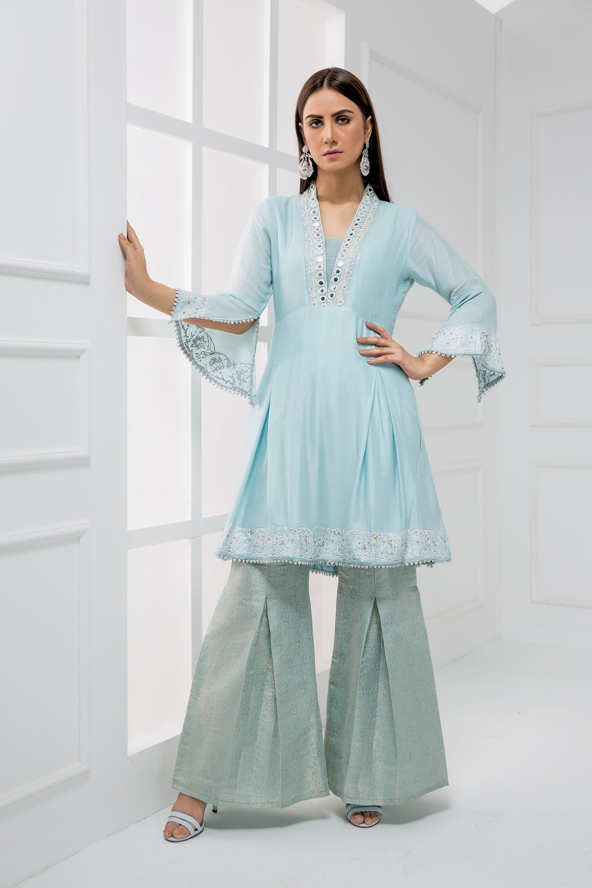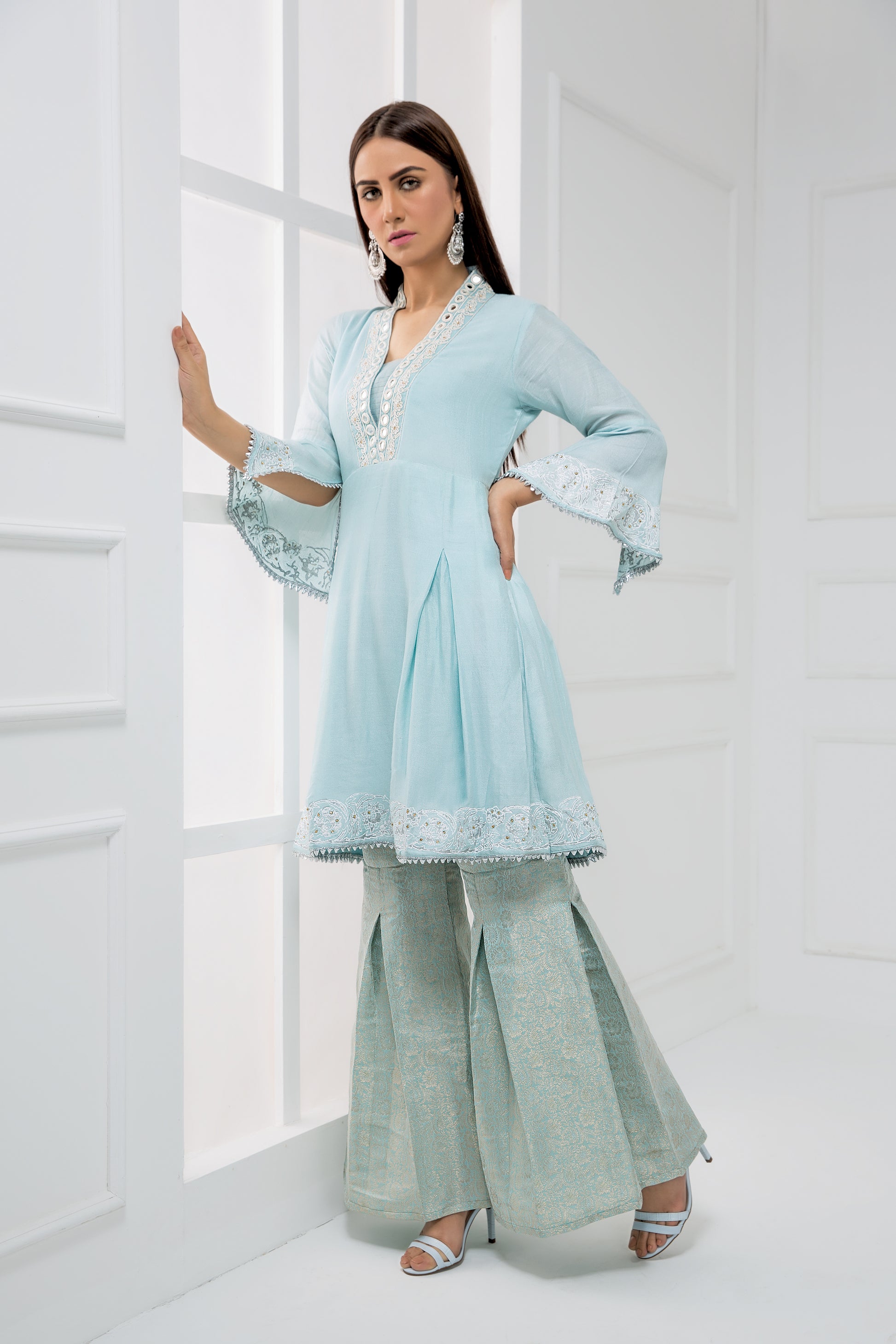 Experience the perfect blend of elegance and comfort with our latest creation - a cotton silk box pleated shirt with delicate hand work and exquisite block print borders, paired with a cotton silk lining and jamavar gharara pants. The box pleated shirt adds a touch of sophistication to your wardrobe, while the intricate hand work and block print borders create a stylish and unique look.
