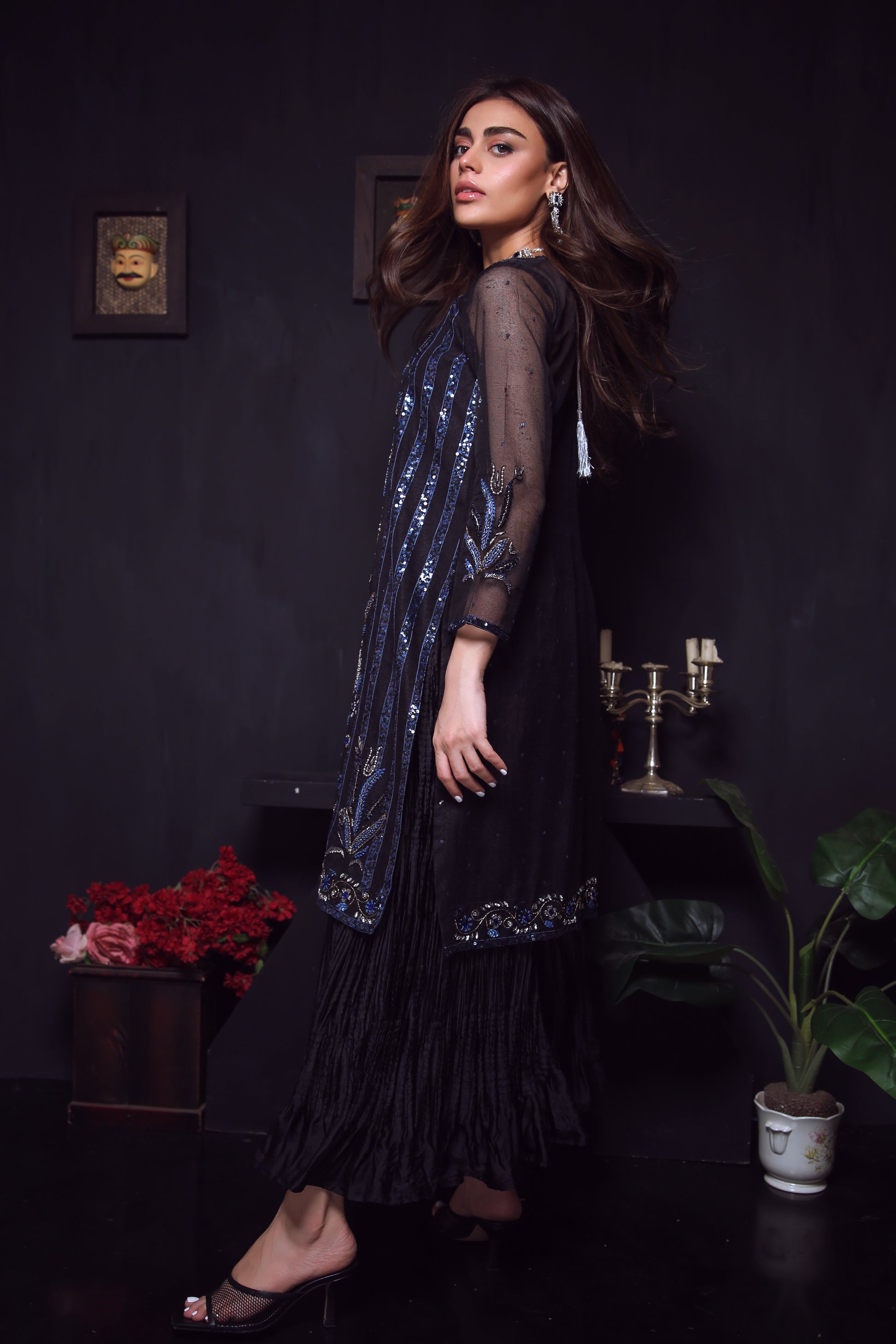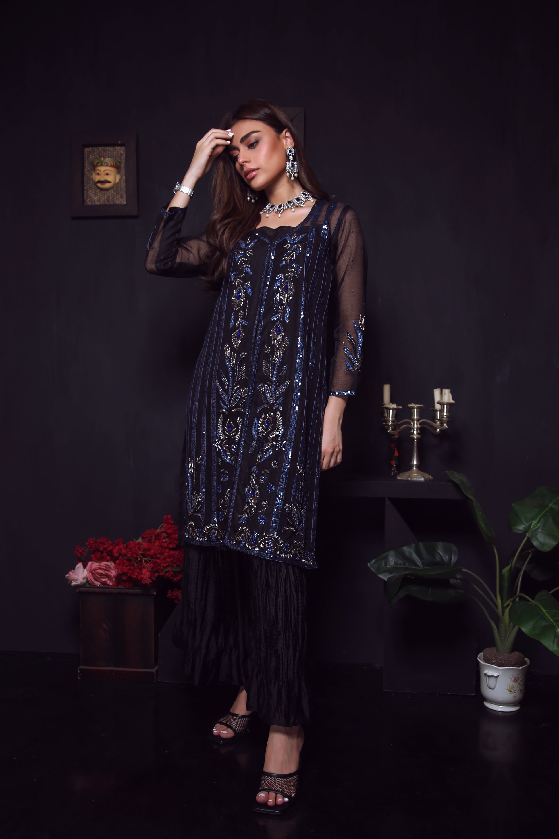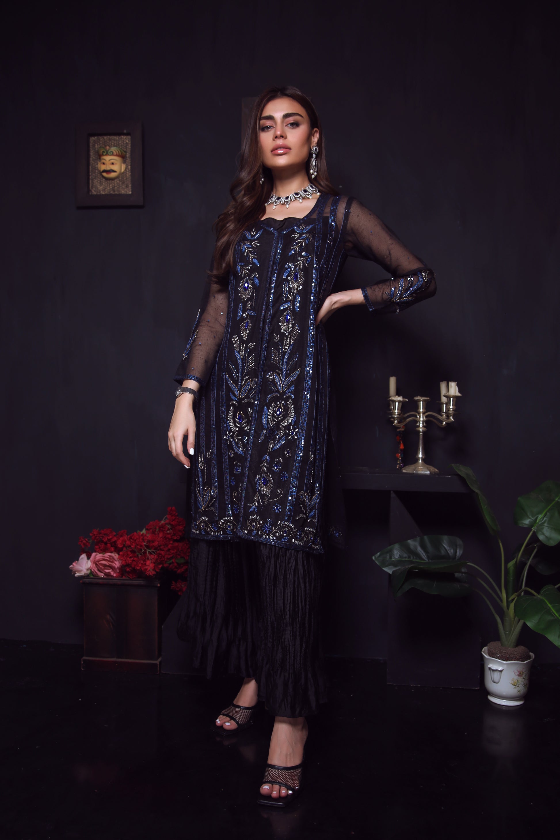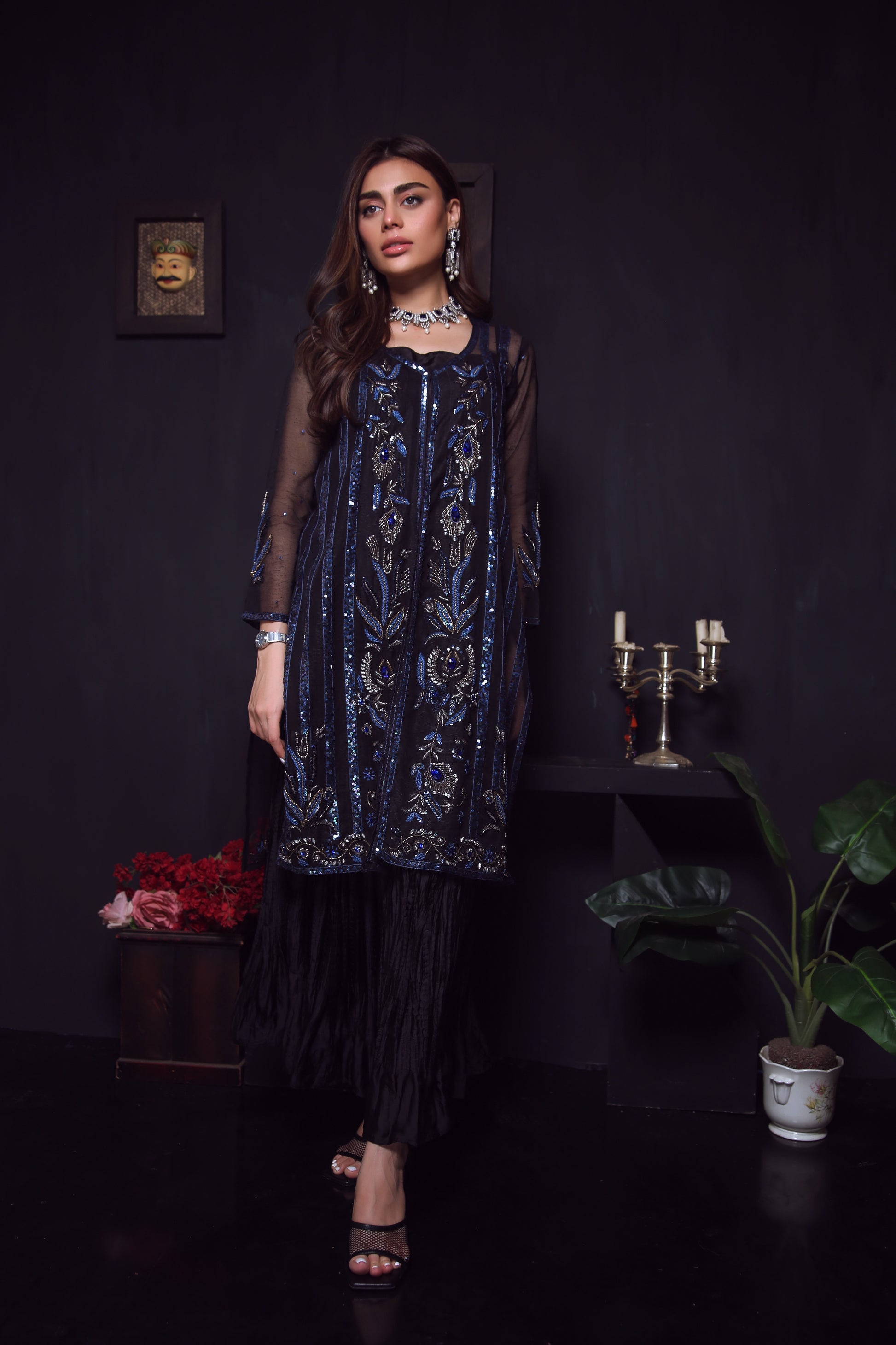 Step out in style with this stunning Khaadi Organza gown featuring intricate zardozi work in a beautiful blend of black and blues with gold and silver accents. The detailed workmanship adds a touch of elegance to the gown, creating a unique and eye-catching look. Paired with trendy crush silk pants, this outfit provides a perfect balance of traditional and modern elements, making it suitable for any occasion.