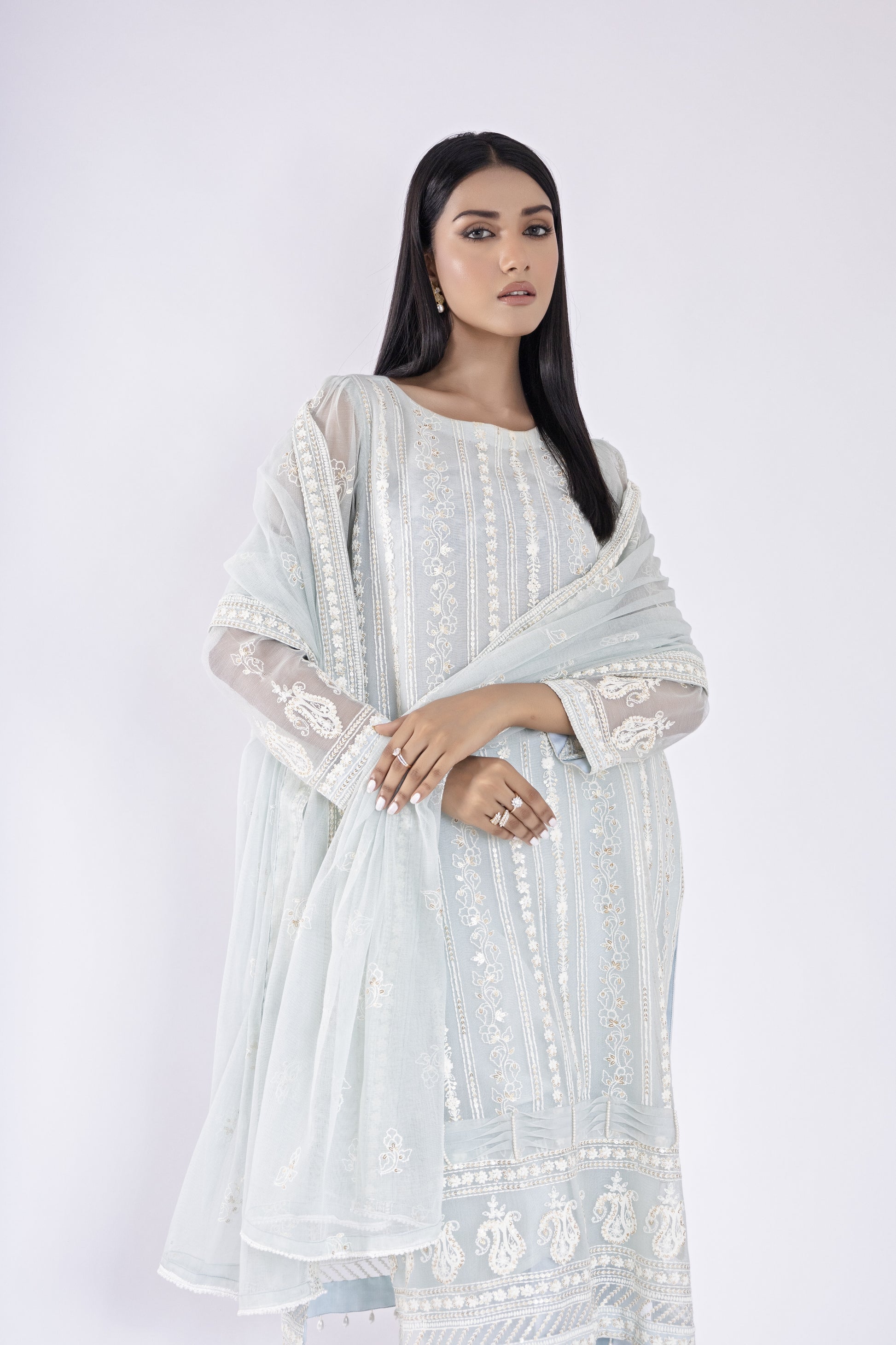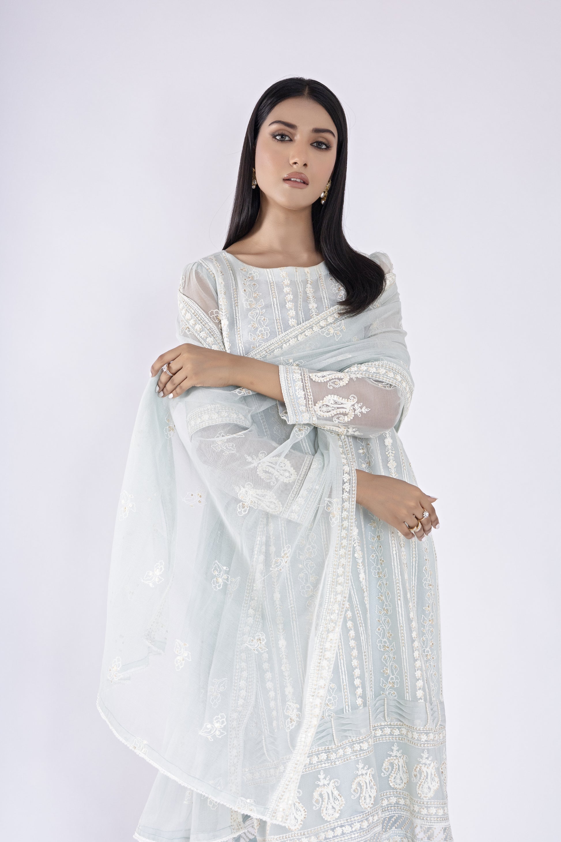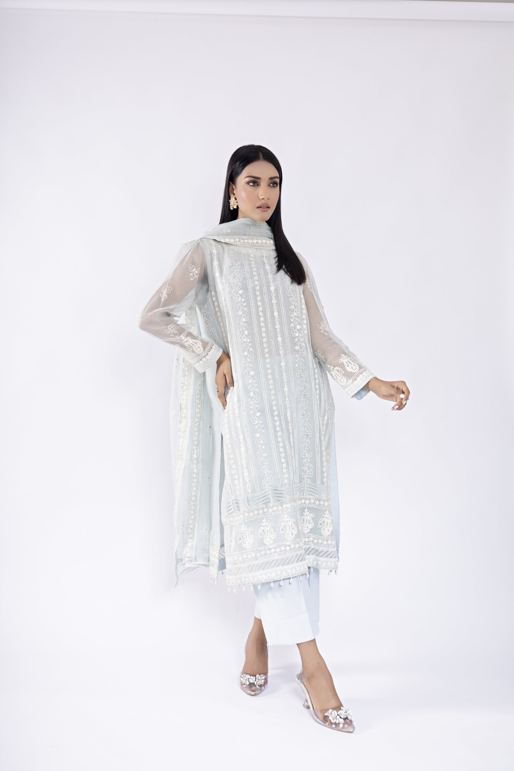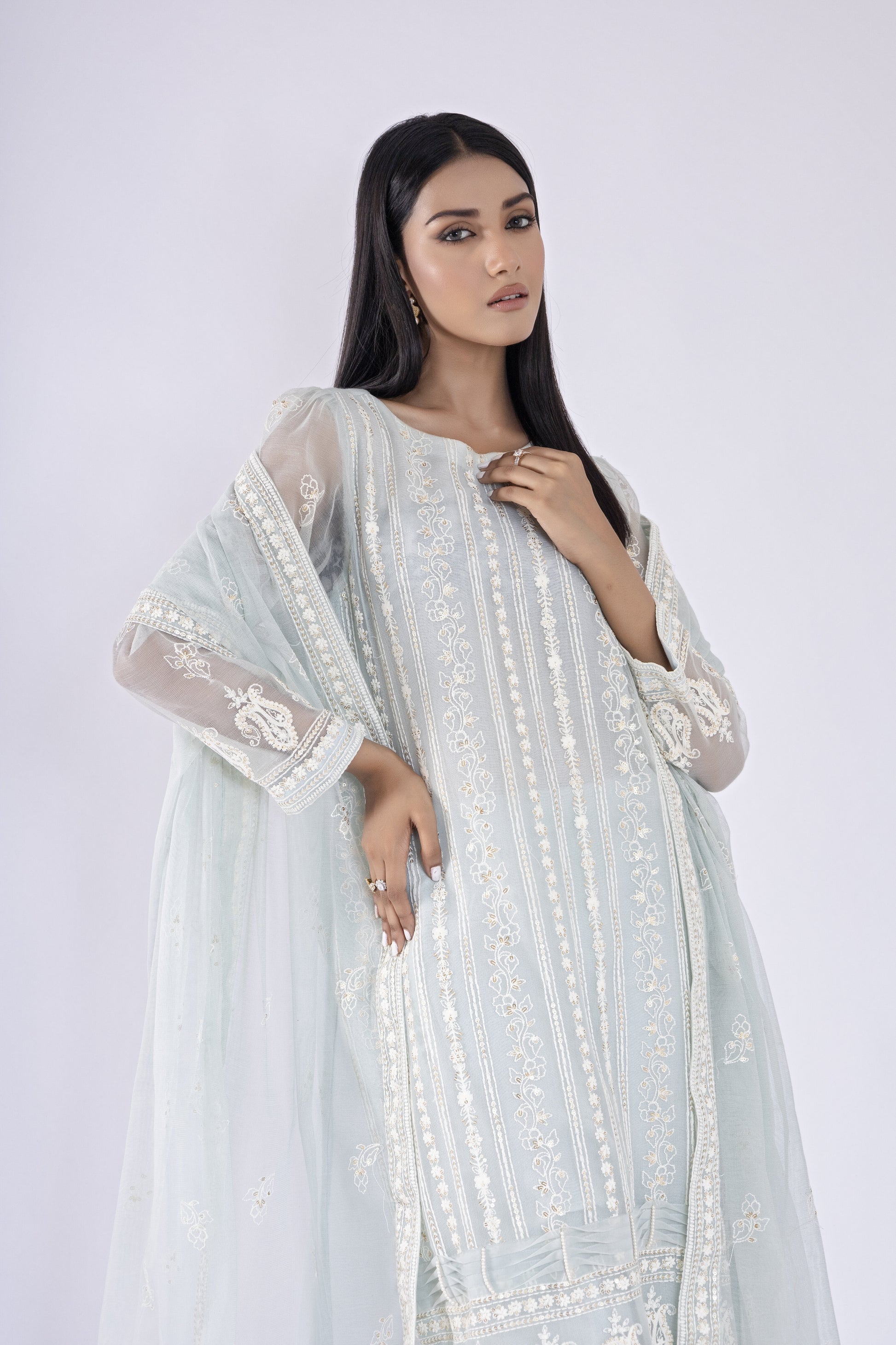Elevate your style with stunning Khaddi Net shirt and dupatta, adorned with exquisite ivory embroidery for an irresistibly elegant and chic look! Embrace the trendsetter in you with  contemporary culottes, adding that perfect touch of trendy flair. Step into the limelight with confidence and grace, turning heads wherever you go!