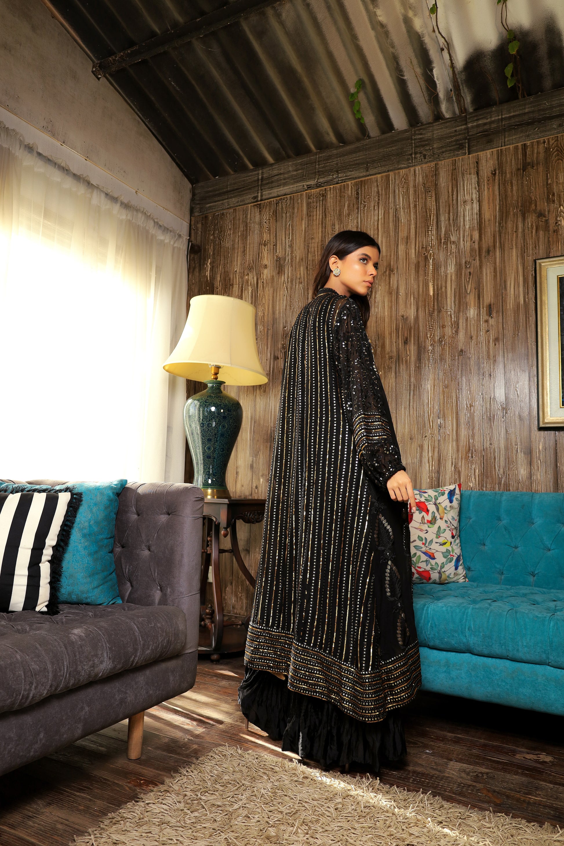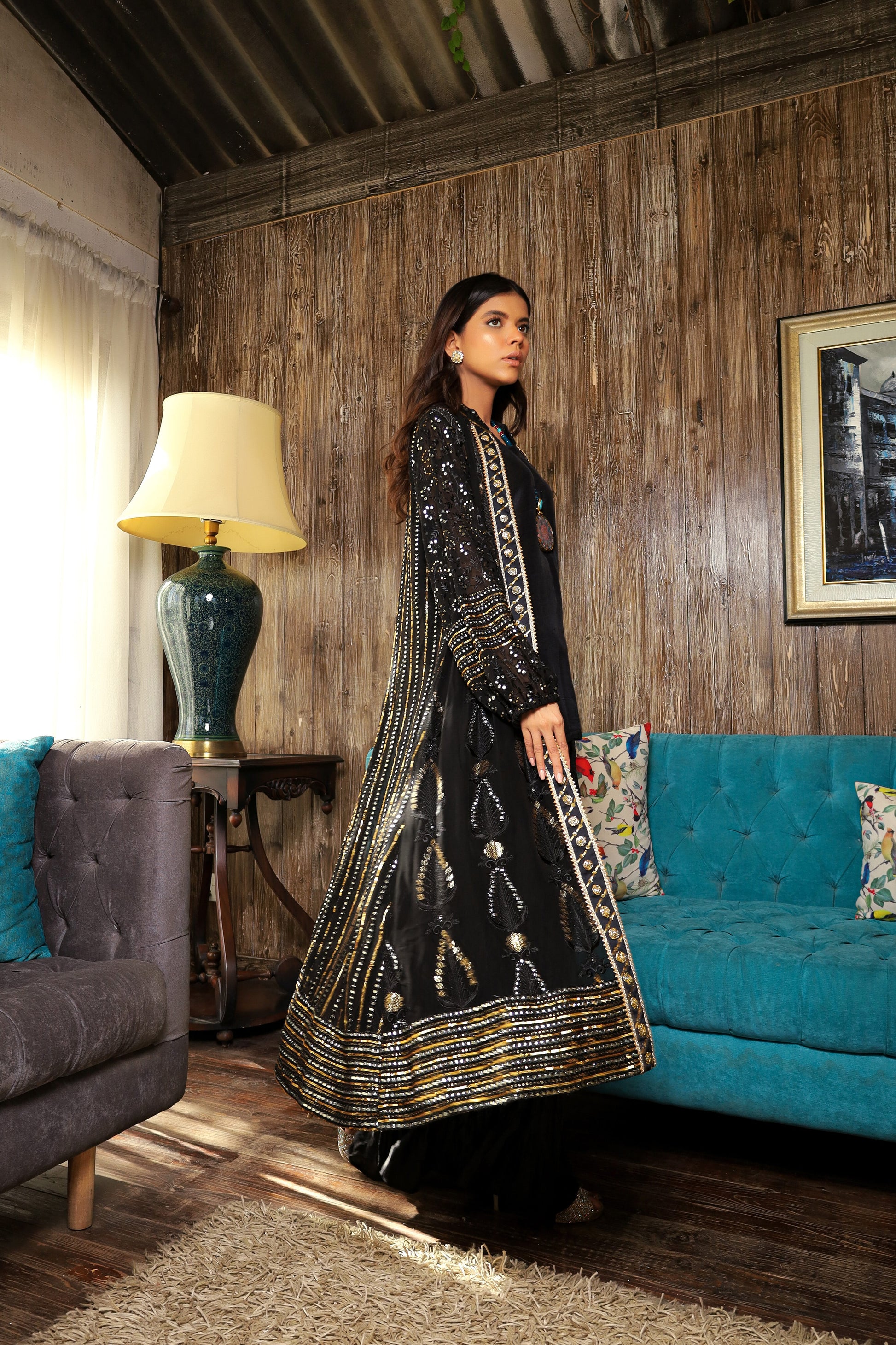 Experience the perfect fusion of traditional and modern styles with this exquisite embroidered chiffon outfit, embellished with intricate gota work. The outfit is paired with trendy crush silk pants and a luxurious silk inner shirt, making it a perfect choice for any occasion. With its unique blend of traditional and contemporary elements, this fusion outfit is sure to make you stand out in any gathering.