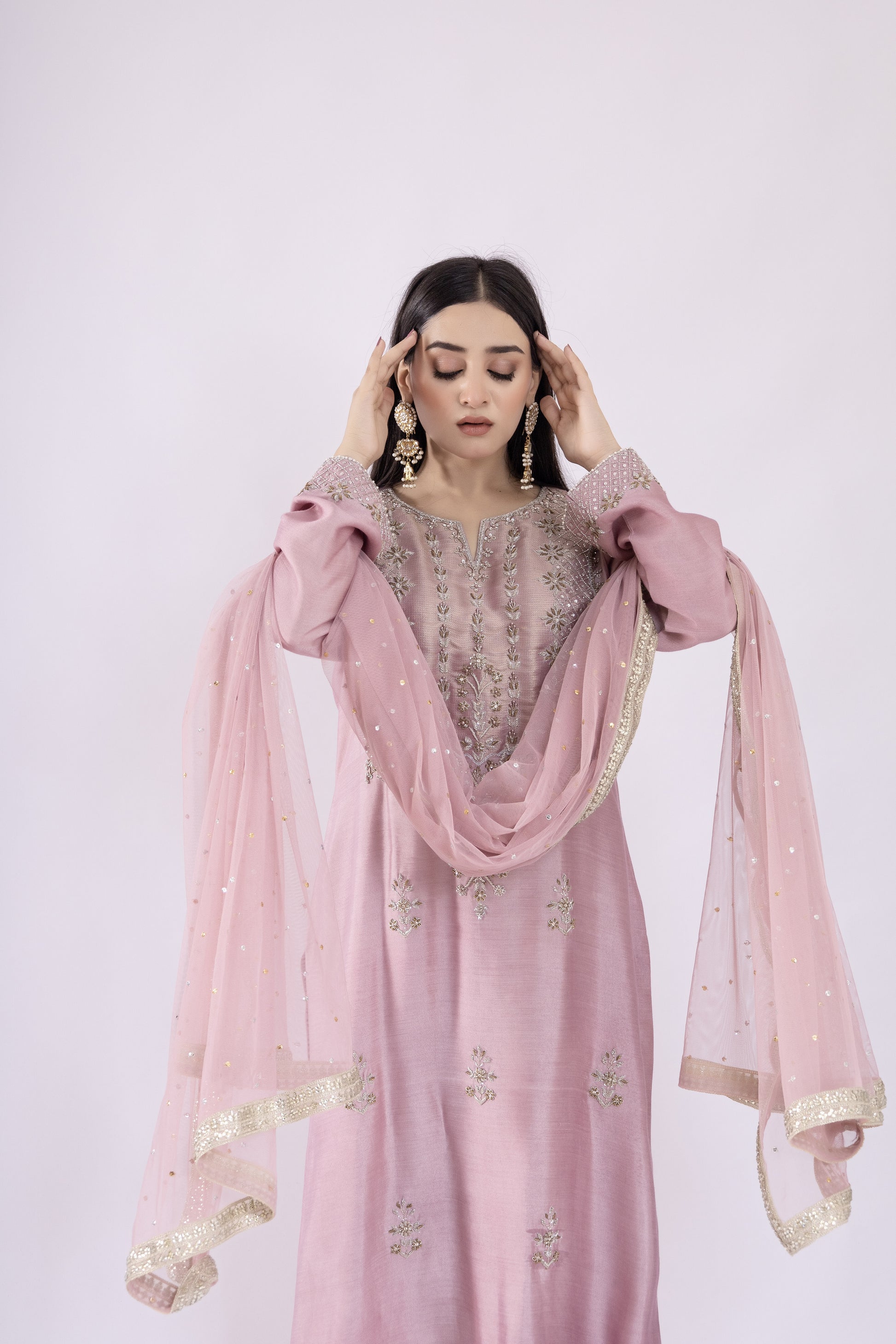 Indulge in sheer opulence with this exquisite Sheesha Silk shirt and culottes set!  The artistry of silver and gold embroidery will leave you breathless, elevating your style to a whole new level of luxury. Drape yourself in sheer elegance with mesmerizing net dupatta, adorned with sparkling sequins that shimmer from every angle. This ensemble is a celebration of true craftsmanship and is sure to captivate hearts wherever you go!