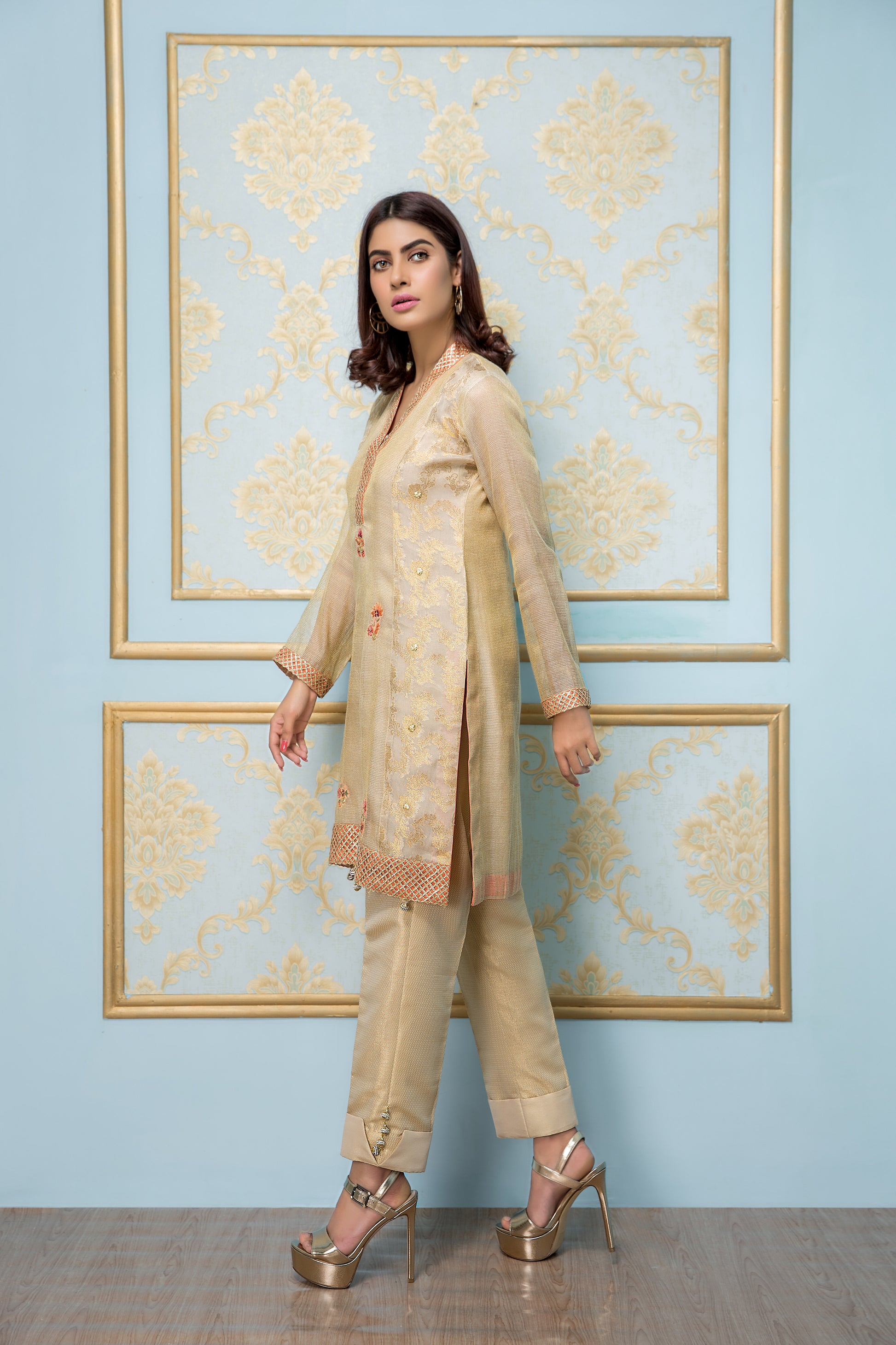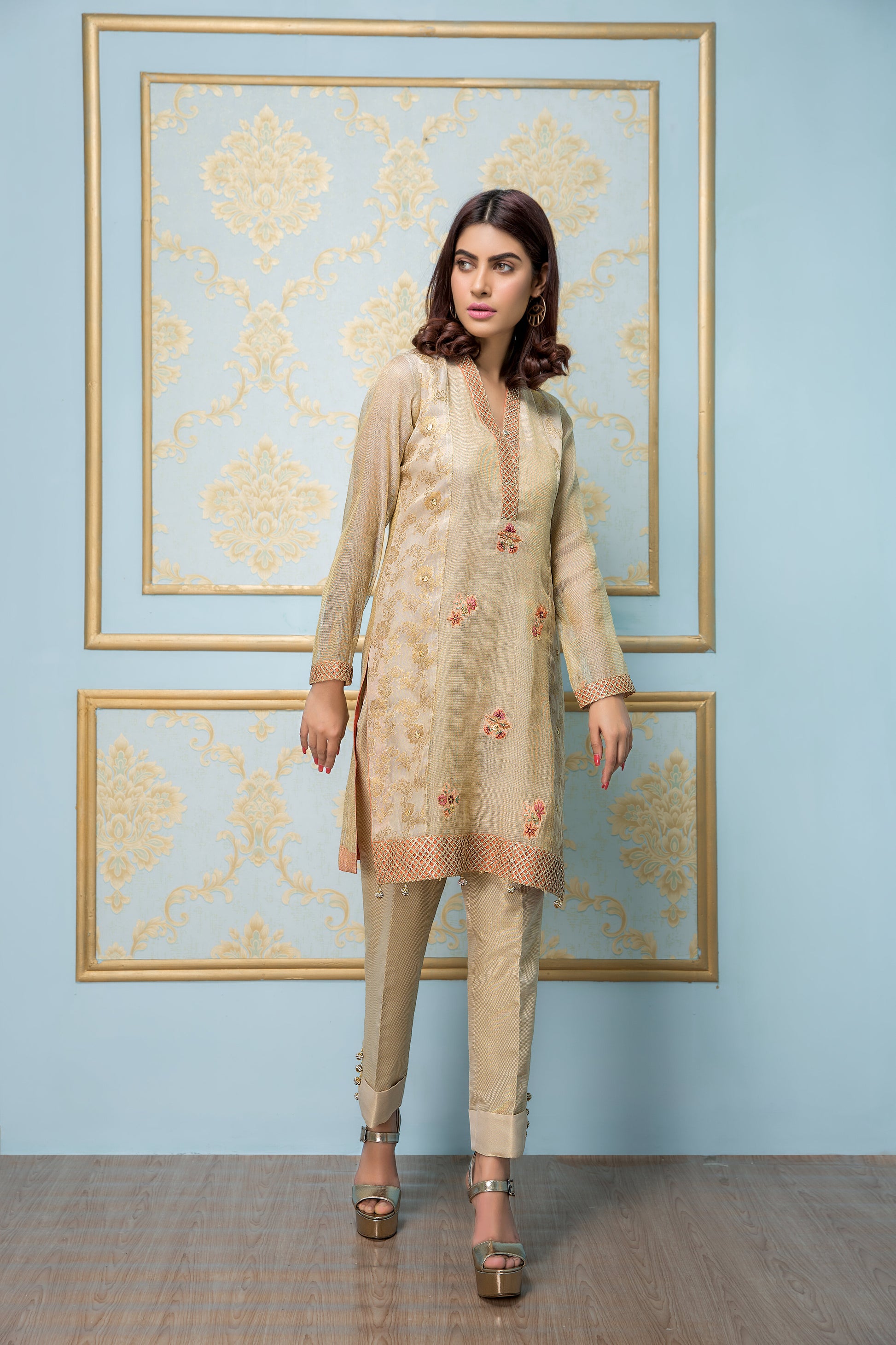 The shimmer jamavar pants are perfect for a night out or any special occasion. They offer a sleek and stylish fit, while the intricate details on the shirt create a sense of elegance and sophistication. Upgrade your wardrobe with this chic and trendy set and be the center of attention at any event.