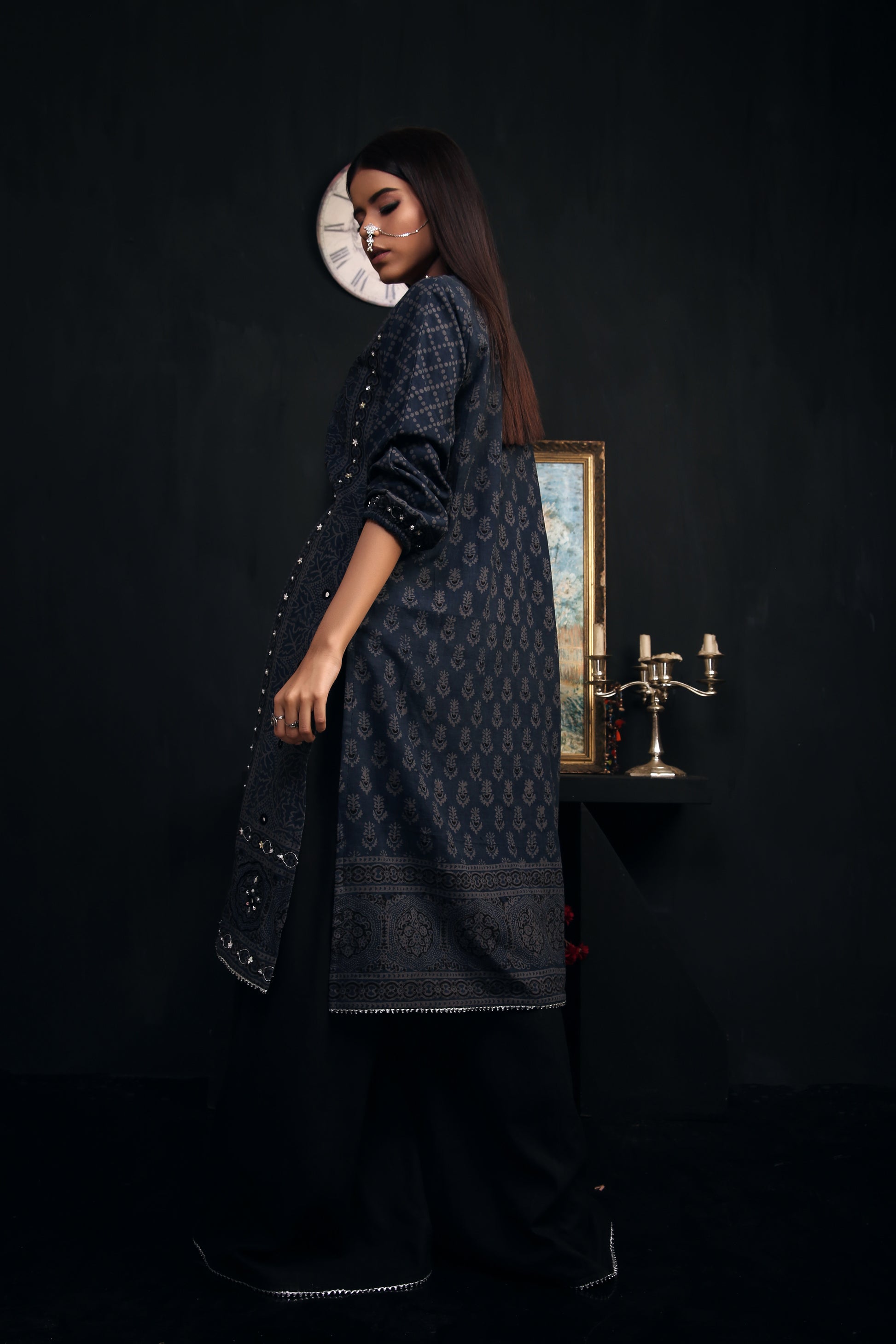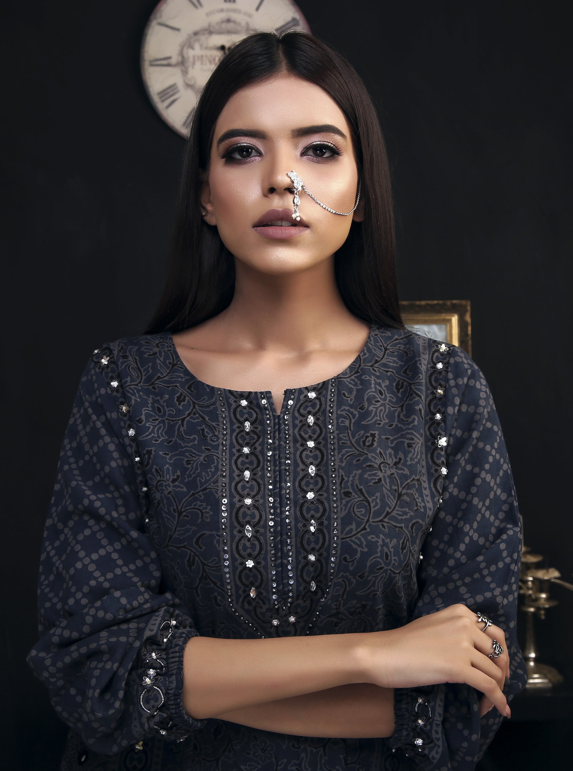 In addition to being stylish, this natural dyed charcoal grey shirt and dhaka pants set is also a great way to support local artisans and their traditional crafts. The handwork, sequins, and diamonte along the gota trims add an extra touch of beauty and elegance to this already stunning outfit.