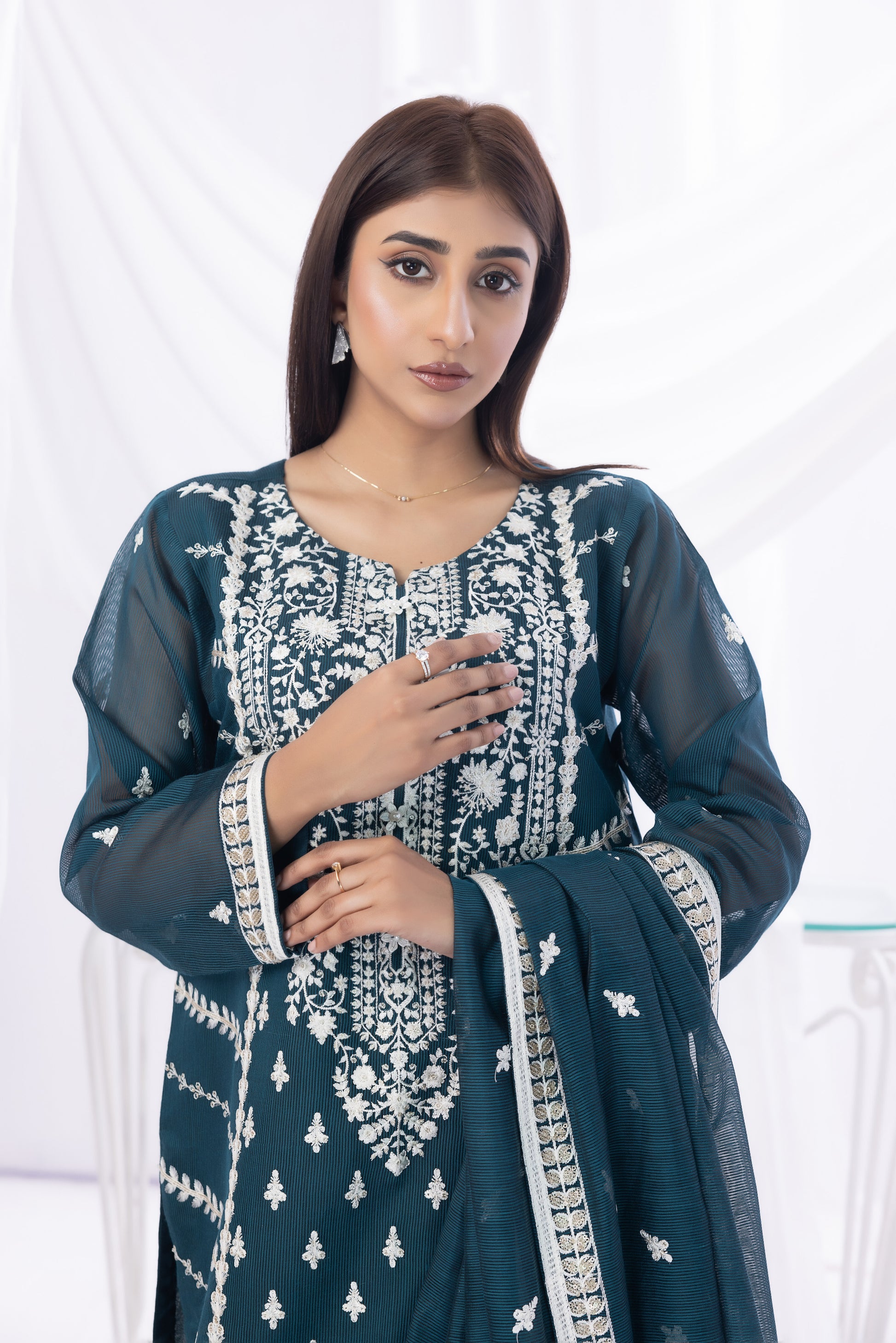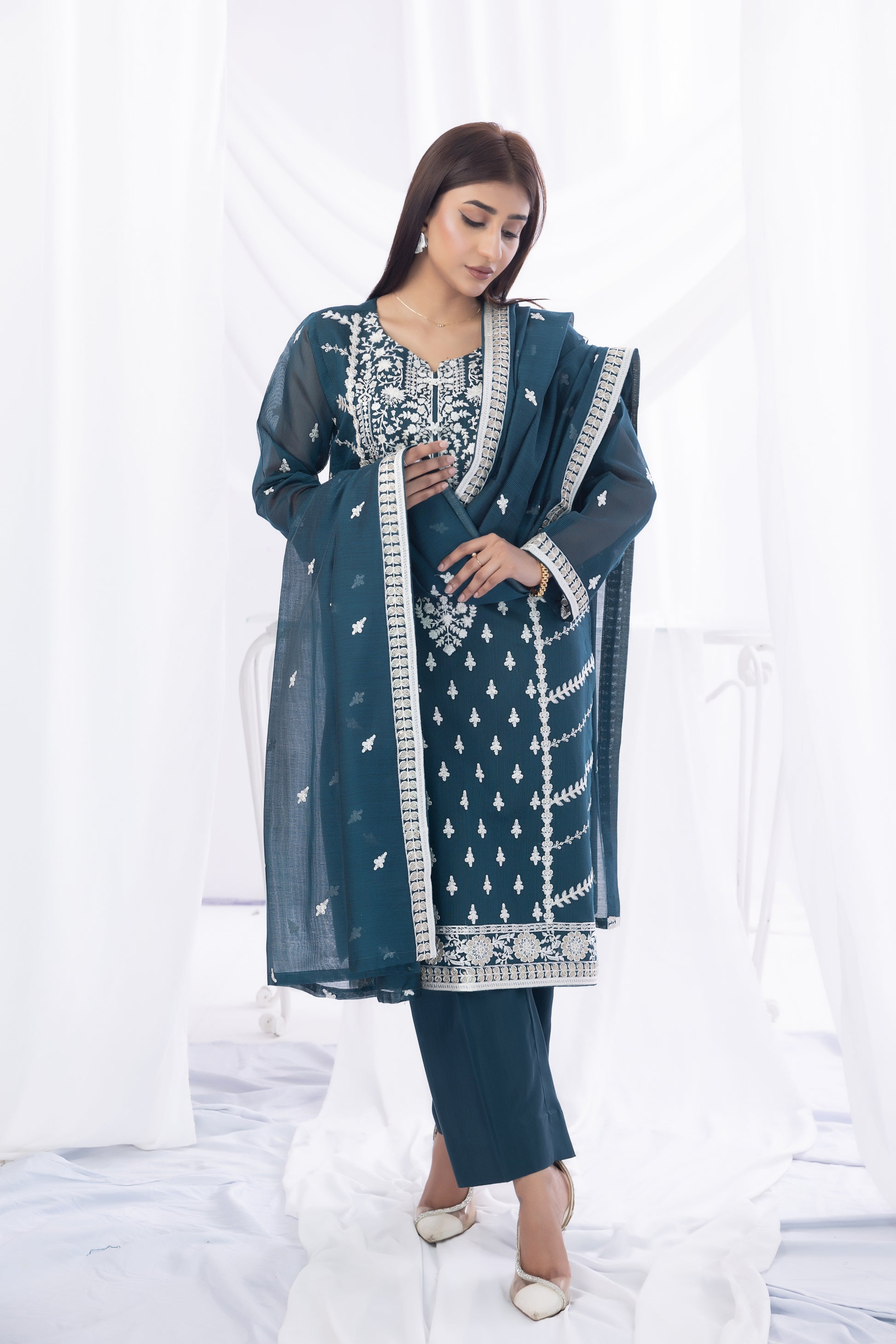 Sabaat elevate your style with stunning teal Khaddi Net shirt and dupatta, adorned with exquisite ivory embroidery for an irresistibly elegant and chic look! Embrace the trendsetter in you with contemporary matching culottes, adding that perfect touch of trendy flair. Step into the limelight with confidence and grace, turning heads wherever you go.