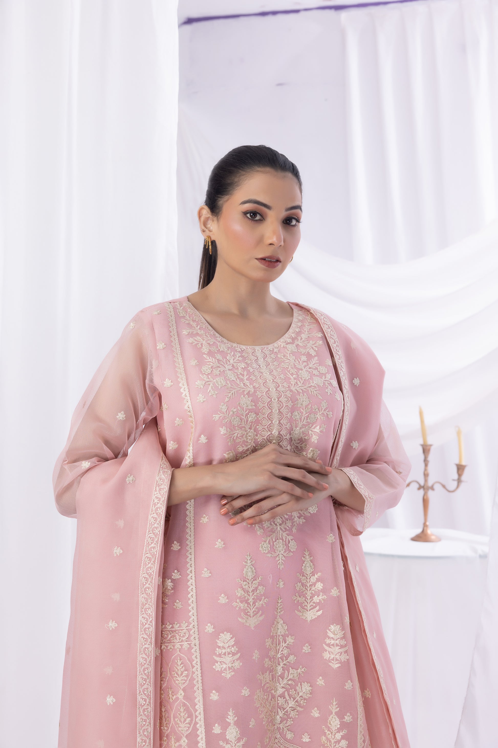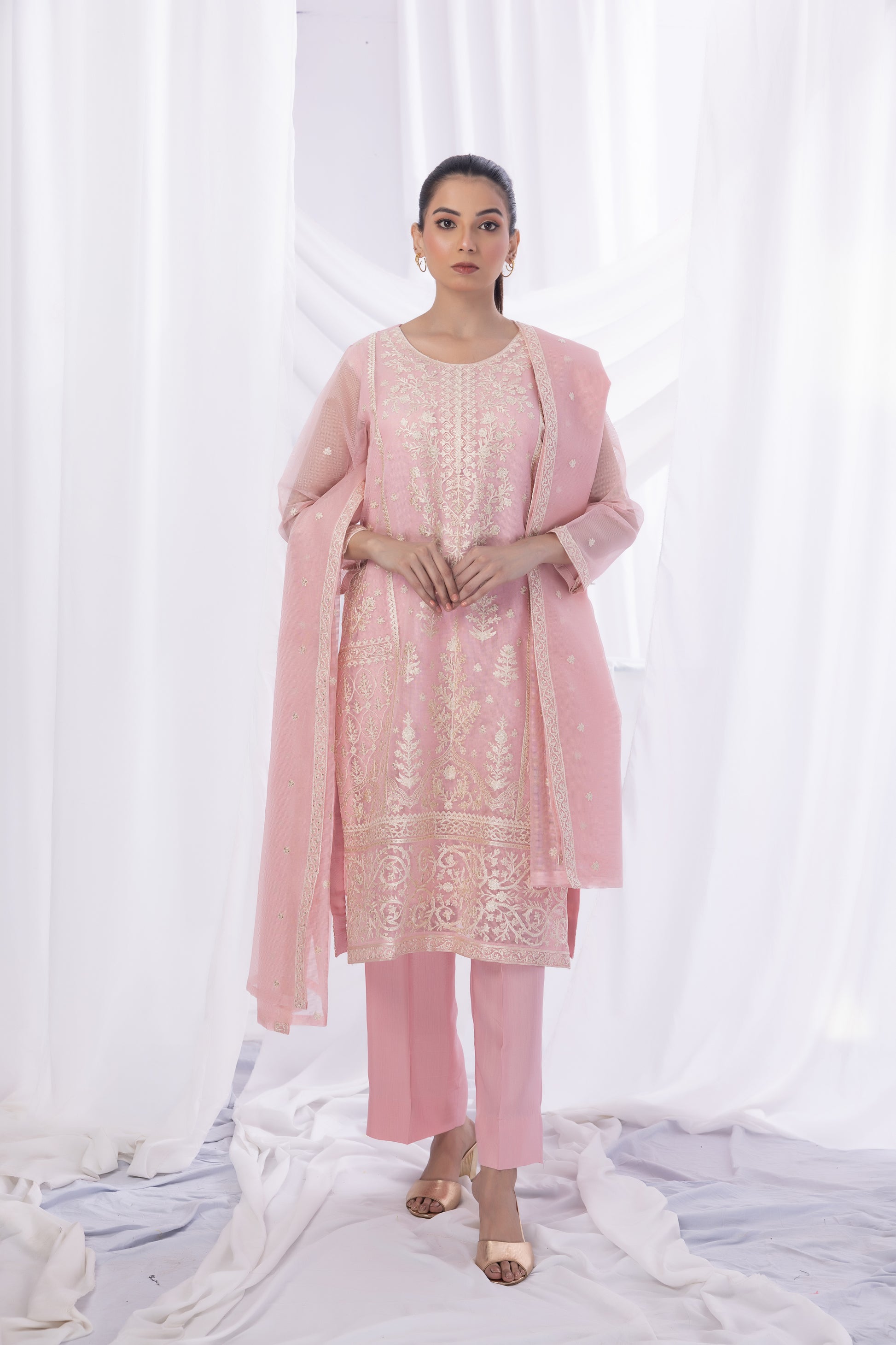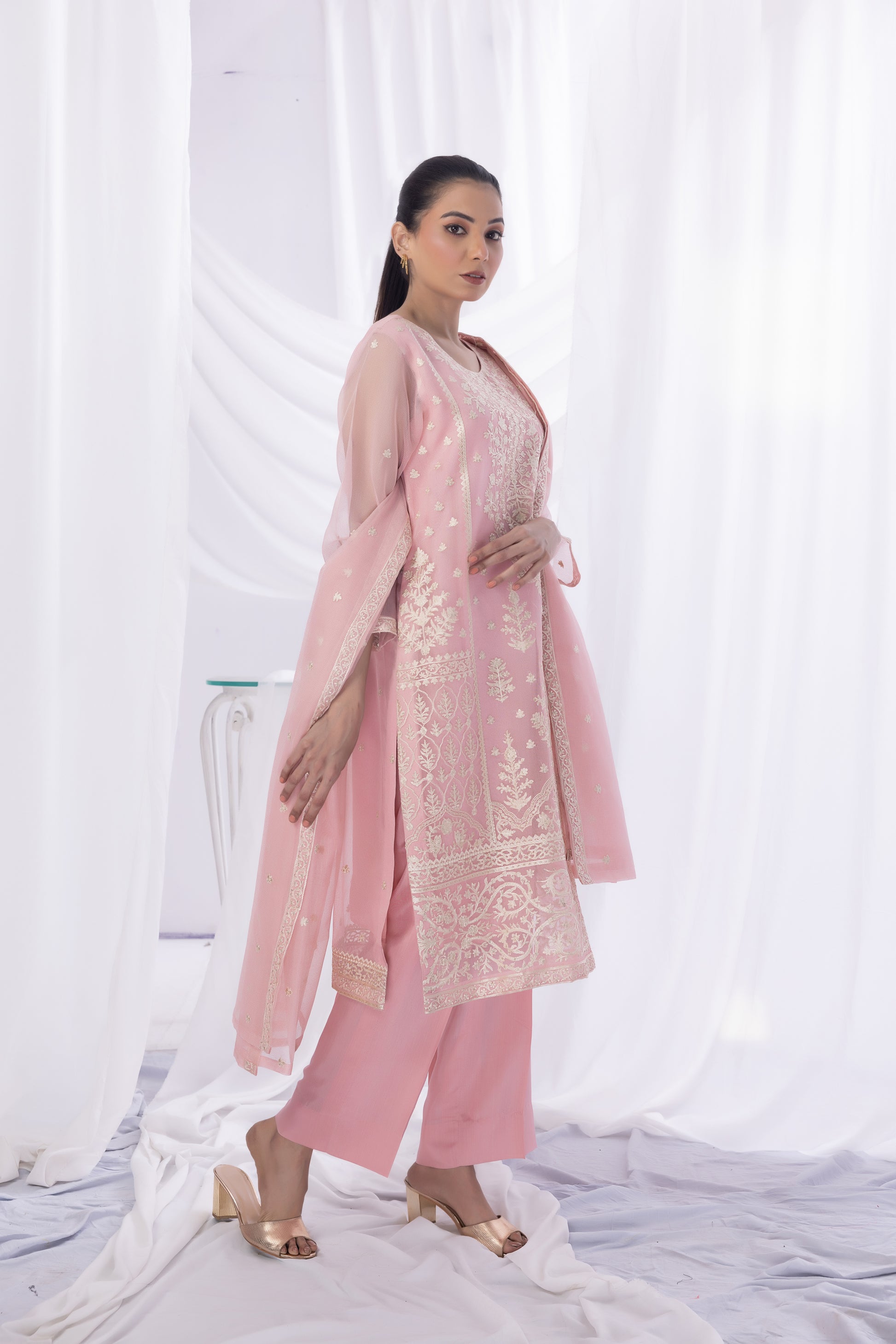 Immerse yourself in the irresistible charm of our Khaddi Net shirt. It exudes elegance, while the khaddi net dupatta showcases beautiful embroidery and intricate detailing. The ensemble is perfectly rounded off with Silk bell pants, adding a modern touch. Wear this outfit to radiate sophistication and style on any occasion!
