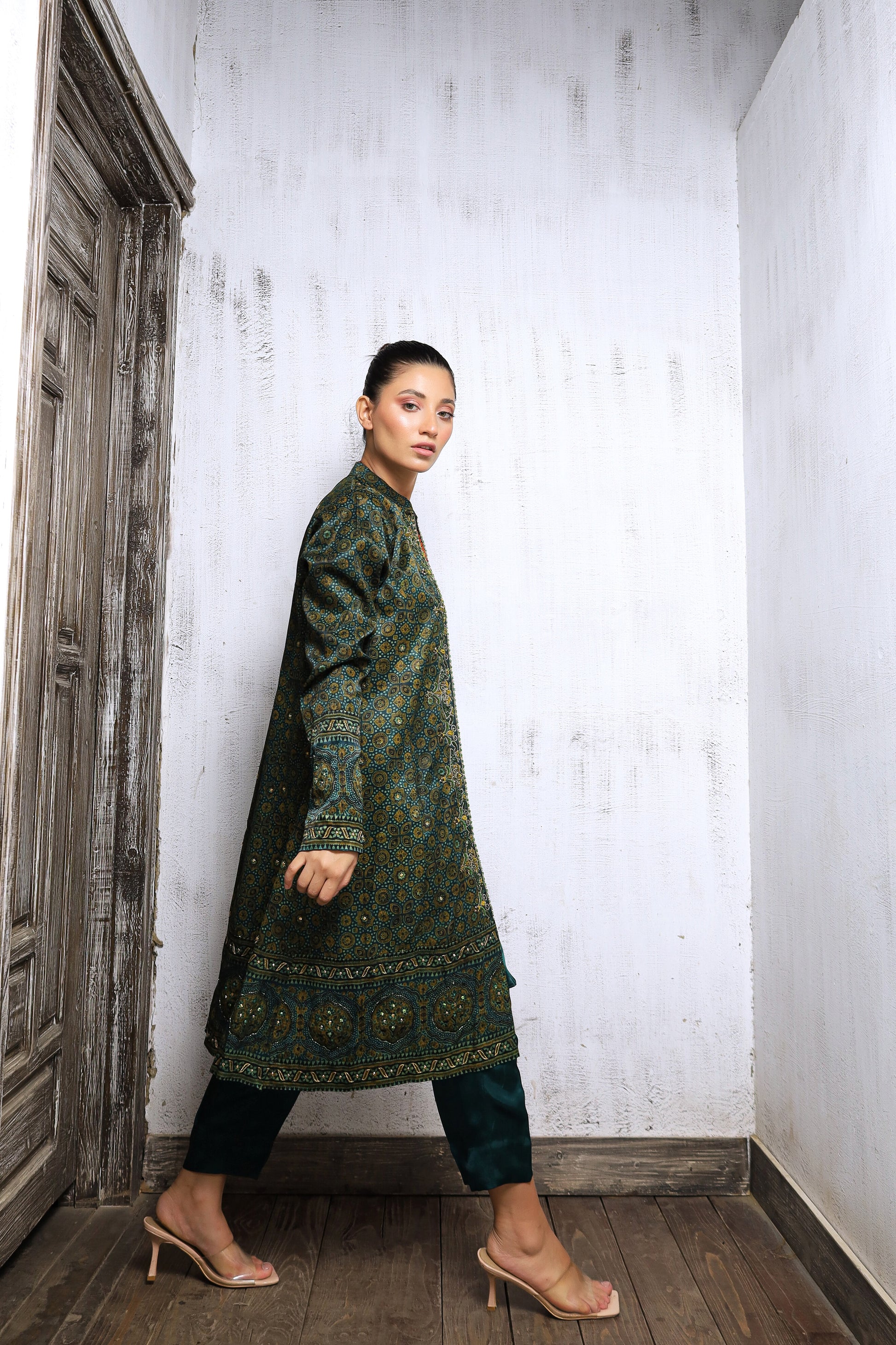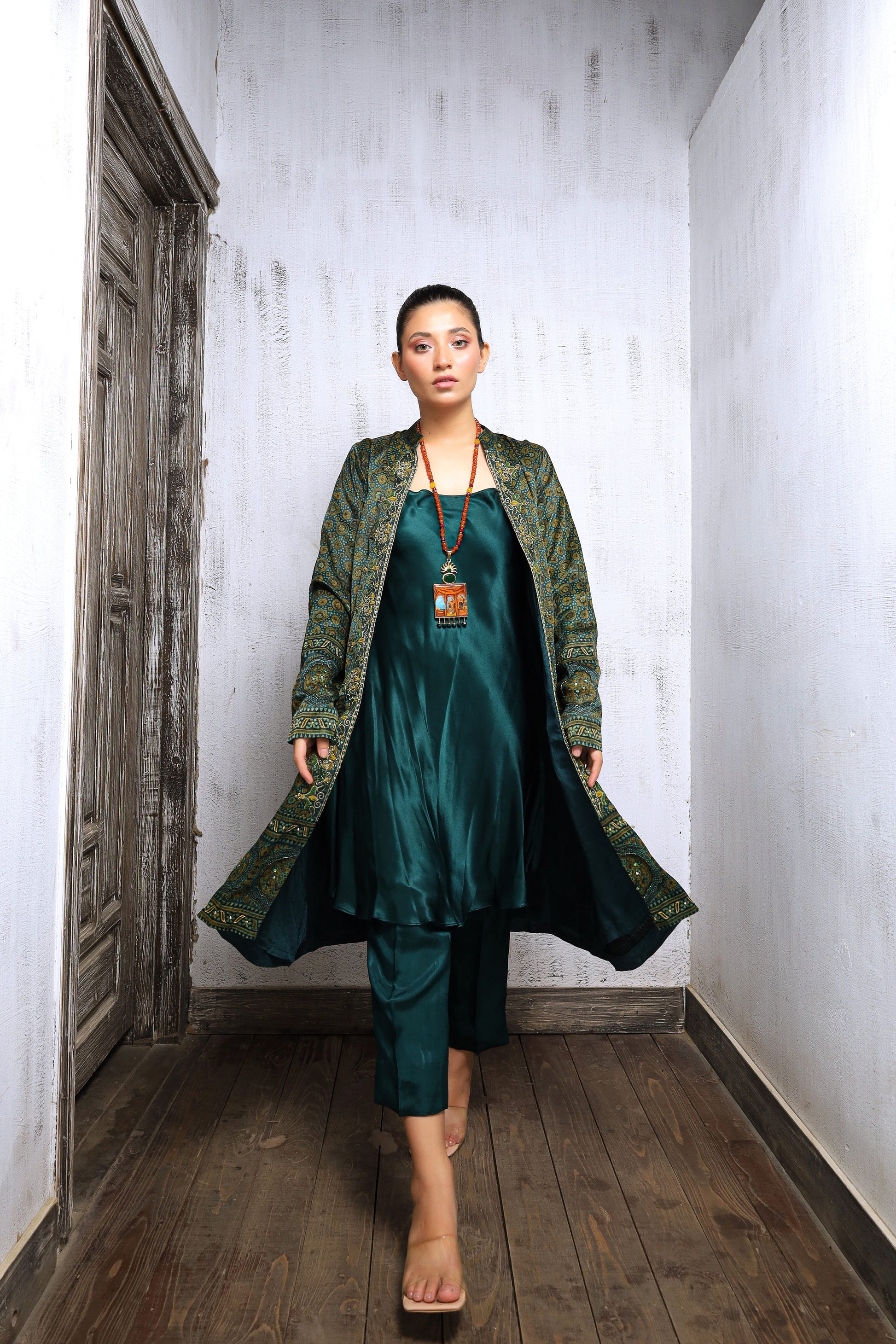 Looking for a stunning outfit that is both elegant and eco-friendly? Look no further than our natural dyed block-print charmeuse silk jacket, featuring intricate handwork that exudes sophistication. Paired with a charmeuse silk inner shirt and stylish straight silk pants, this ensemble is perfect for any formal event.