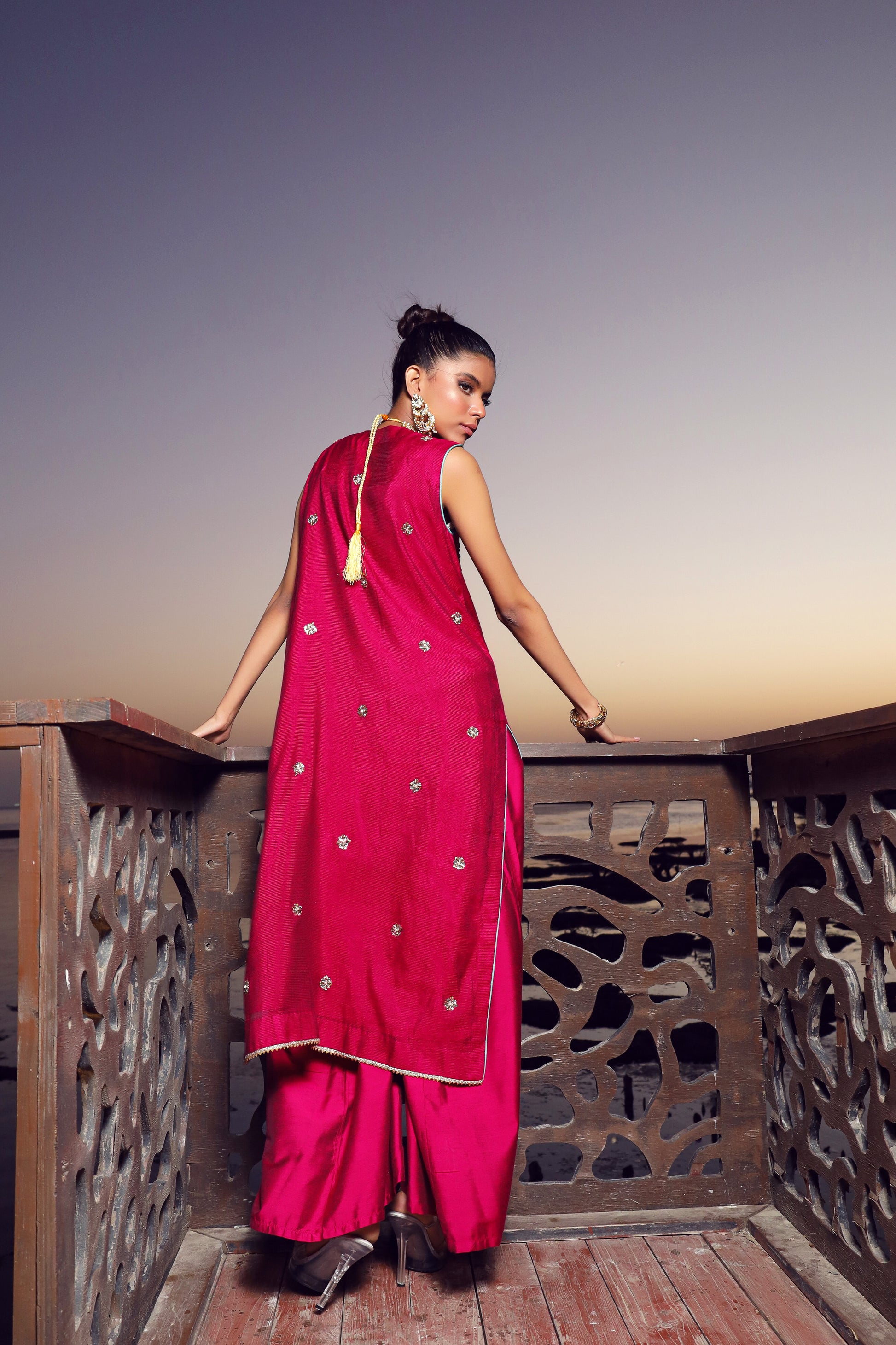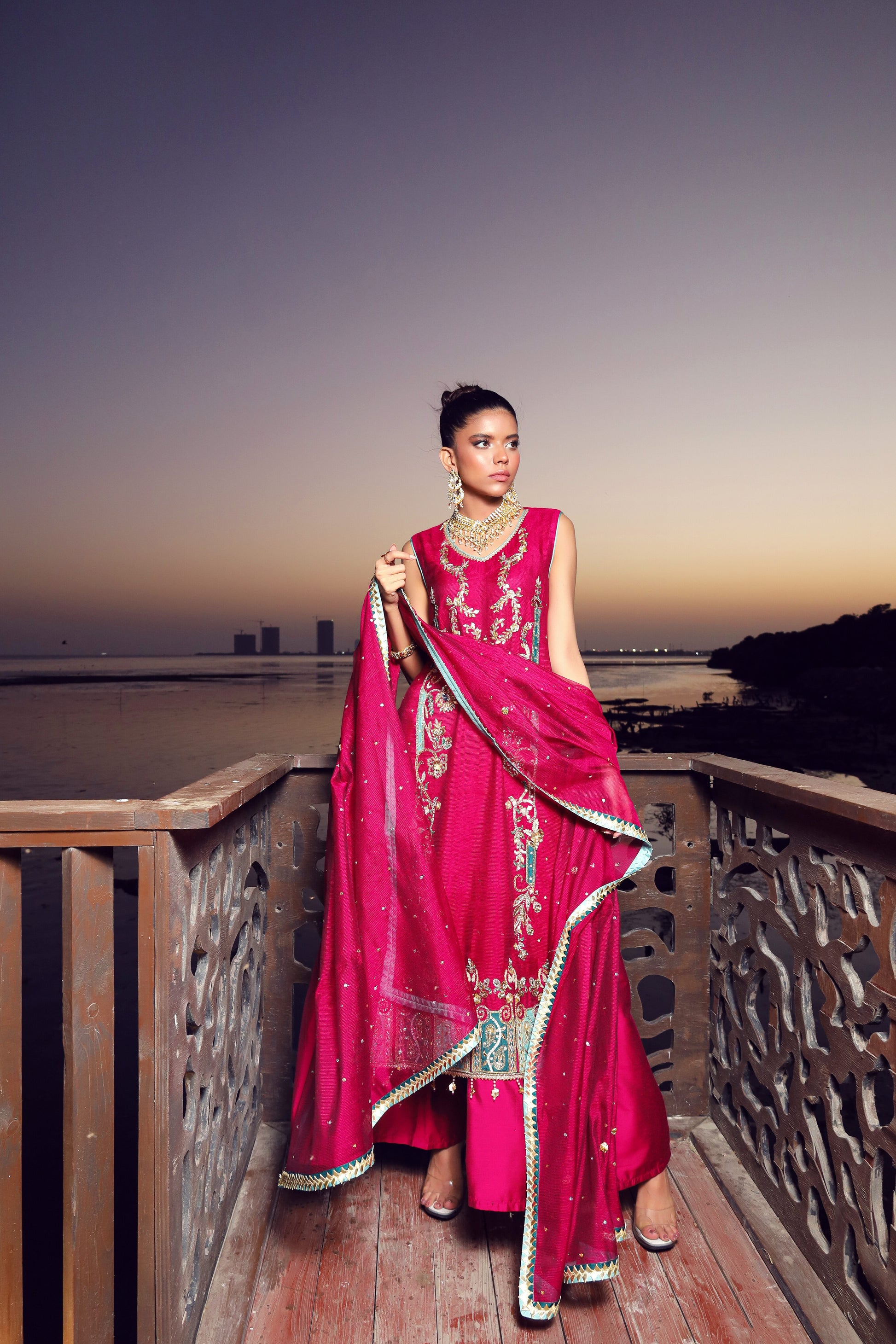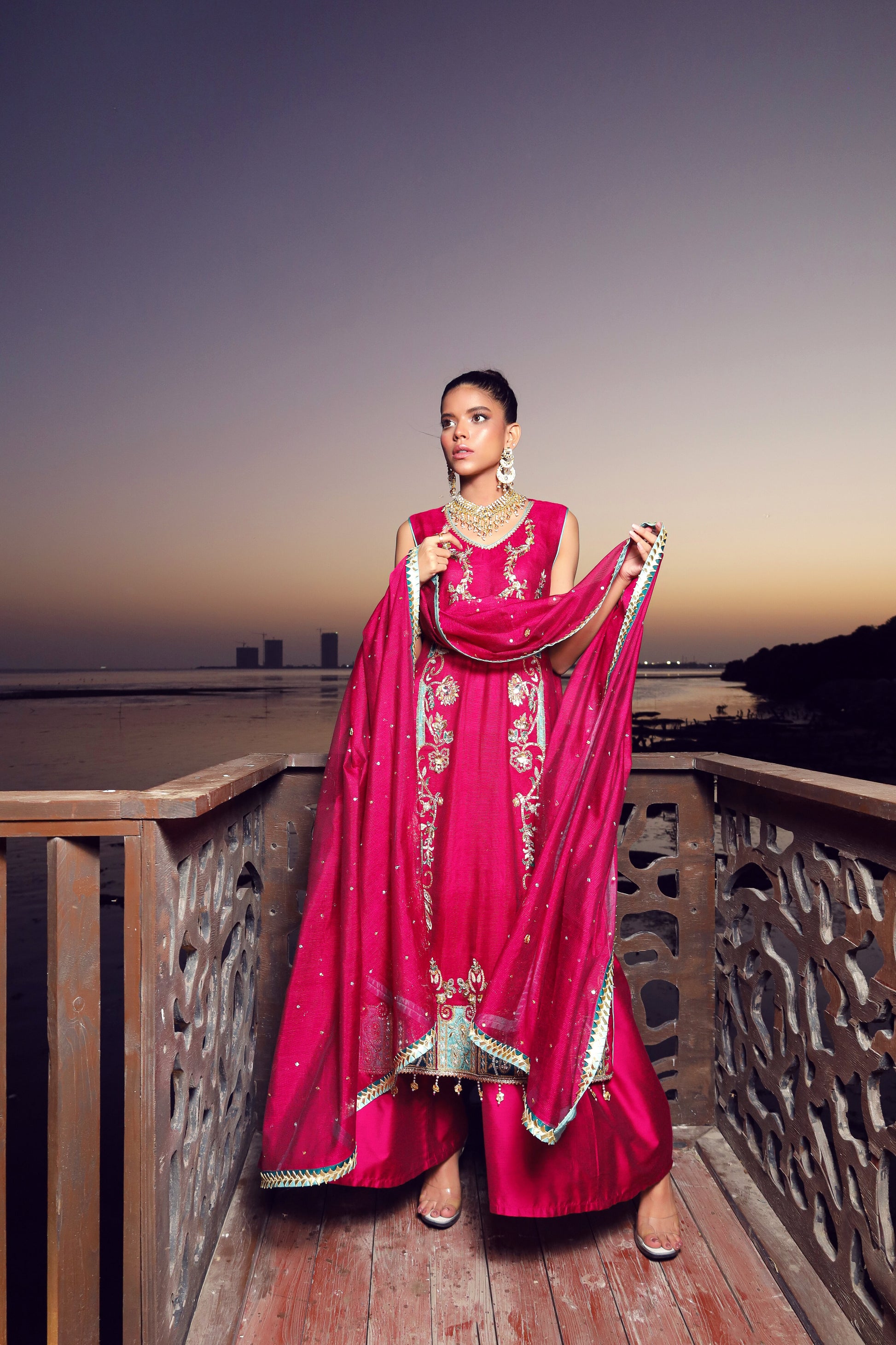 The gota style adds a touch of glamour to the dupatta, while the two-tone color finishing creates a beautiful visual effect. The outfit is completed with panel pants, which would provide a traditional and classic look to the ensemble. The pants can be designed with the same fabric as the shirt or a contrasting one to add an extra layer of dimension. Overall, this outfit is a stunning and elegant choice that would be perfect for any formal occasion or wedding.