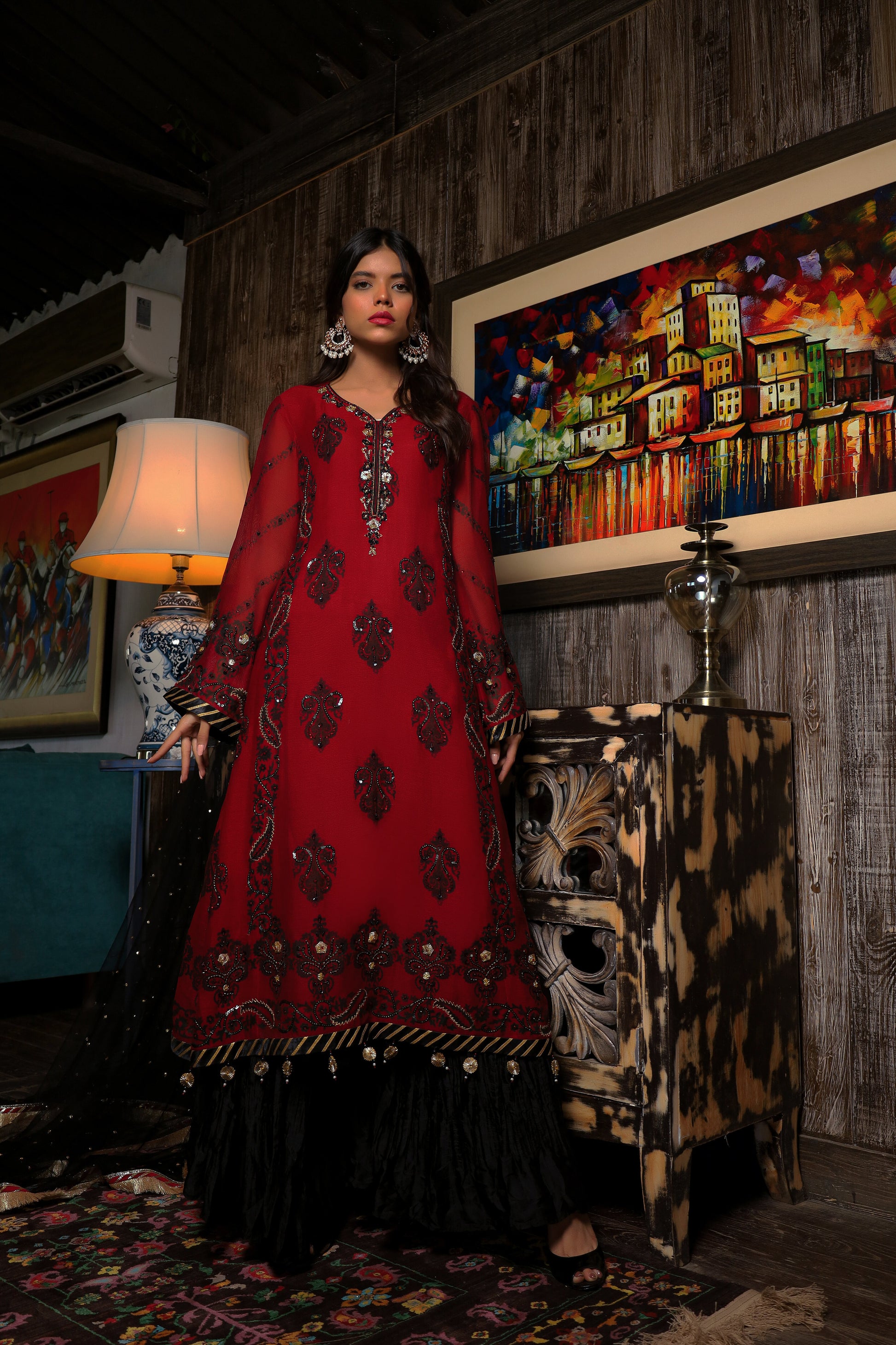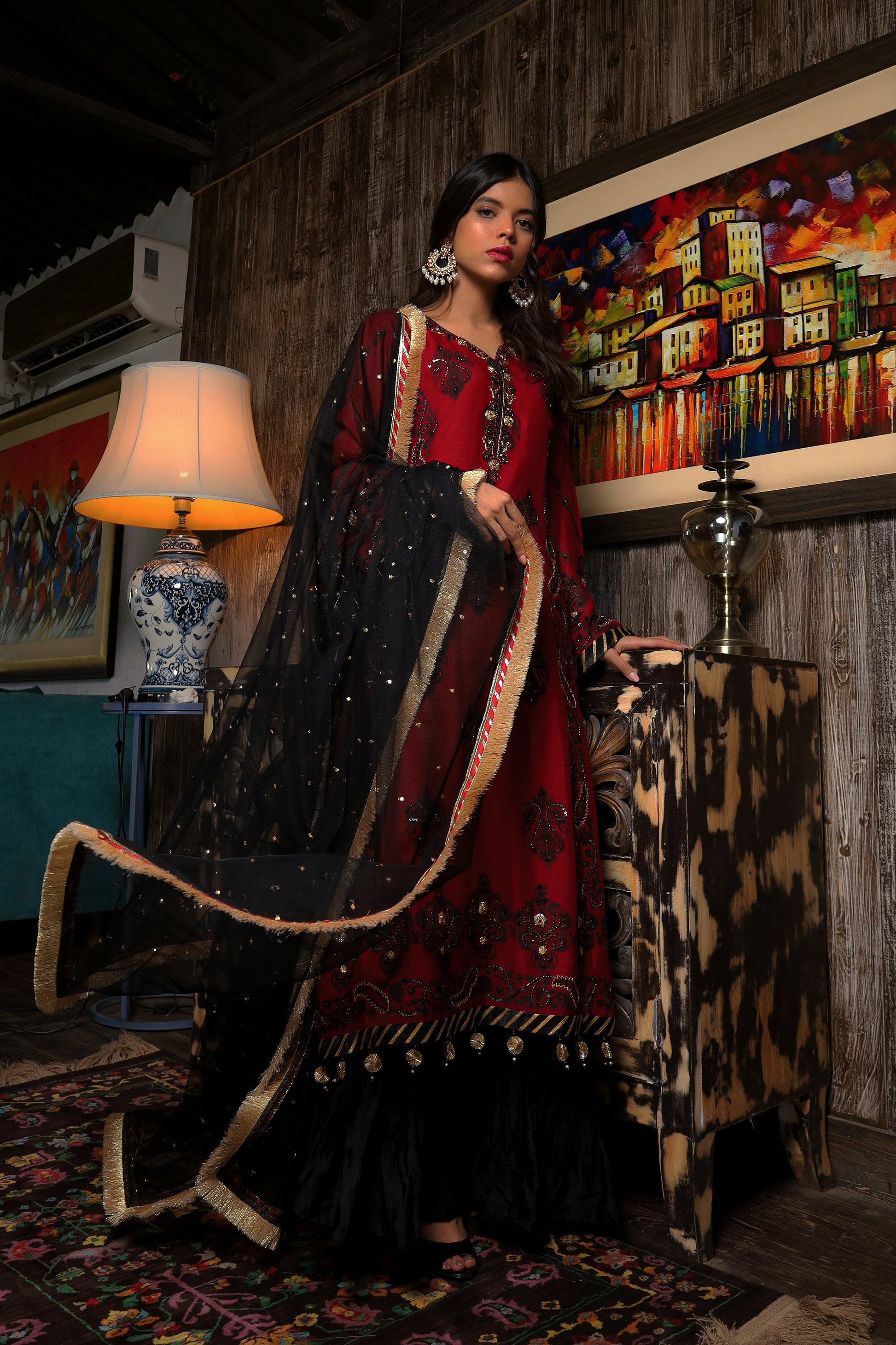 The combination of maroon and black in silk net with block print and zardozi work creates a stunning traditional outfit. The intricate block print and zardozi work add texture and depth to the fabric, while the combination of maroon and black adds elegance and sophistication. Paired with trendy crush silk pants, the outfit is given a modern touch, with a unique texture and comfortable fit.