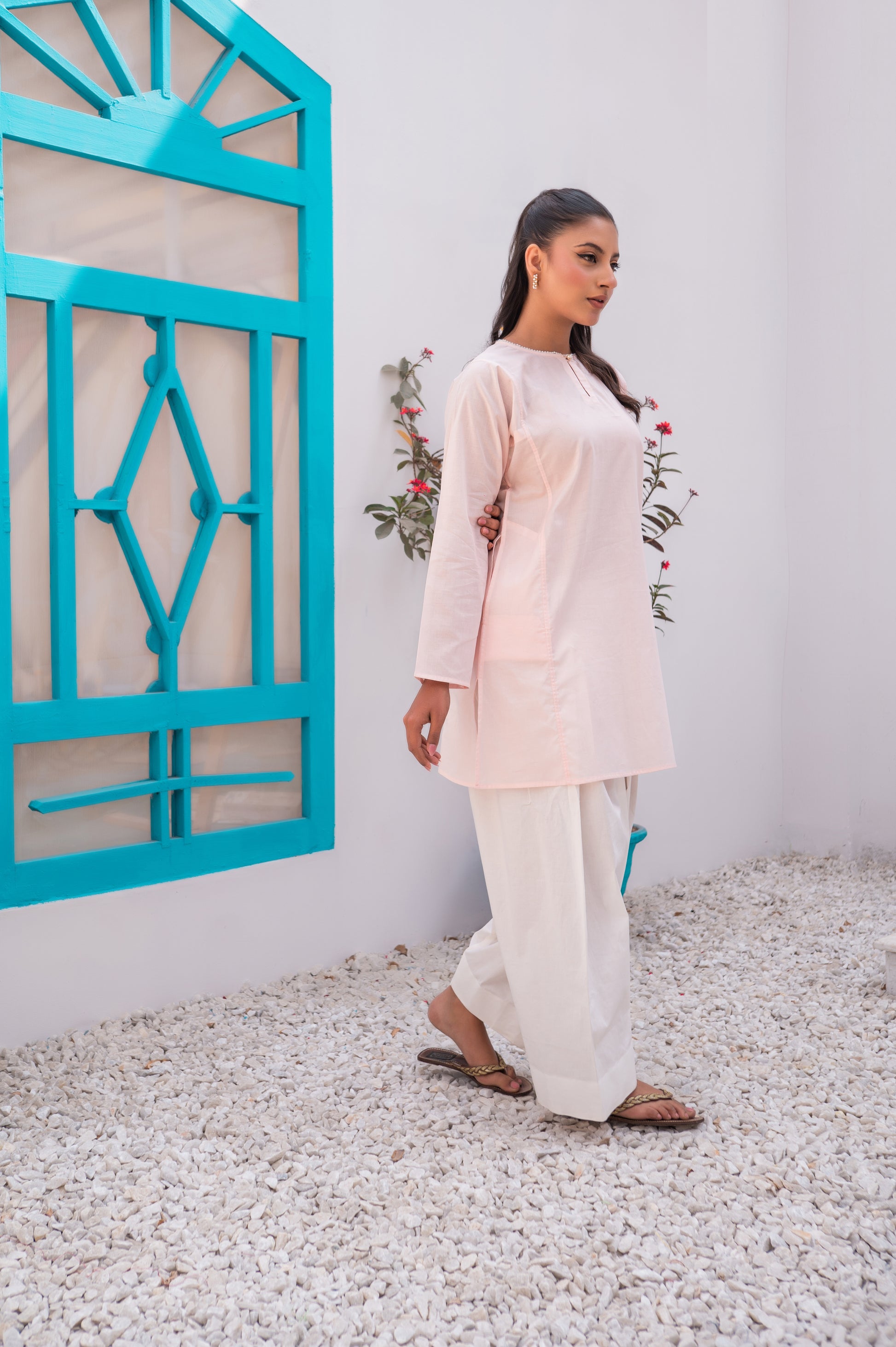 Zinnia features two pockets and pearl trims, adding both style and functionality to the look. This outfit is perfect for casual outings or relaxed gatherings.