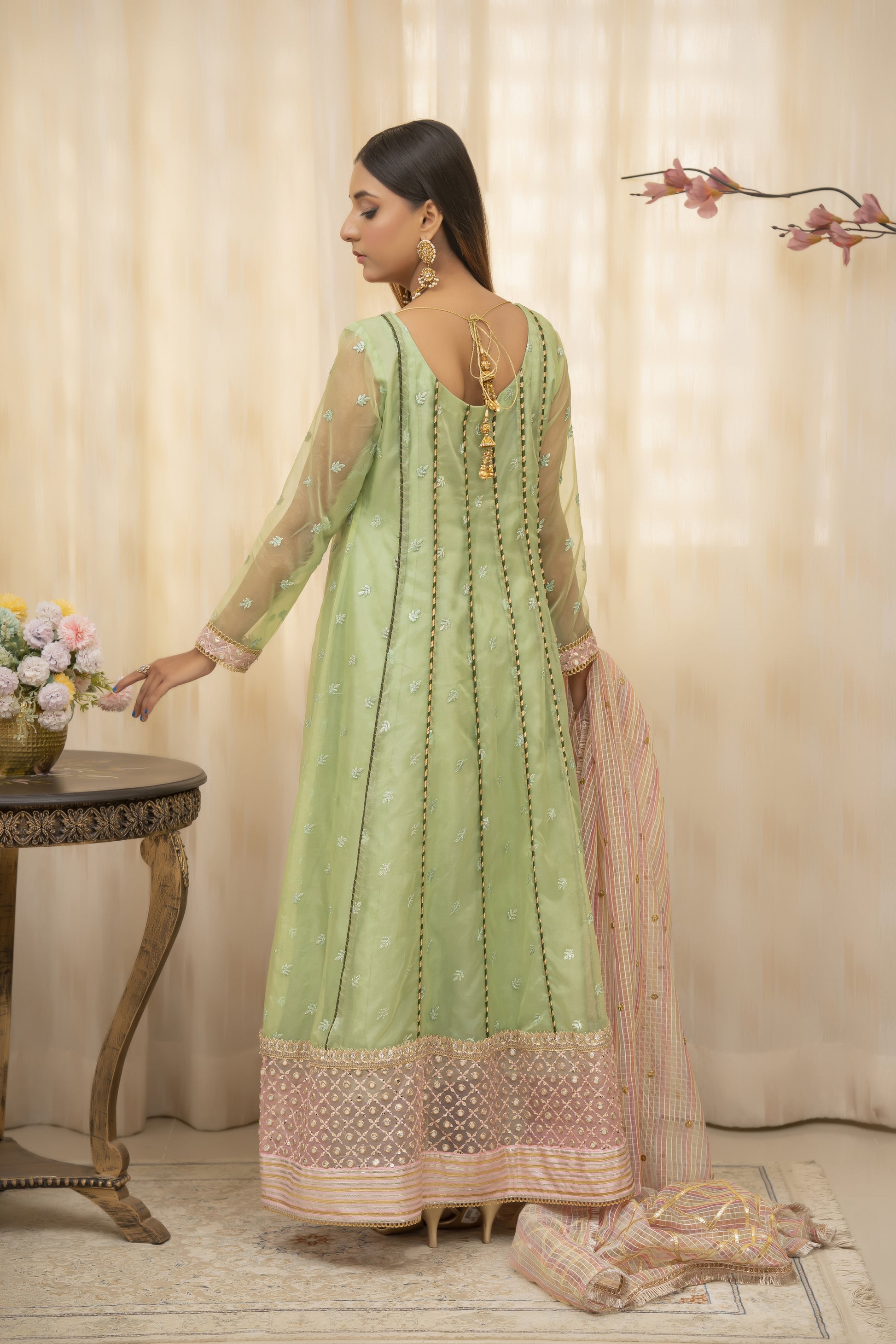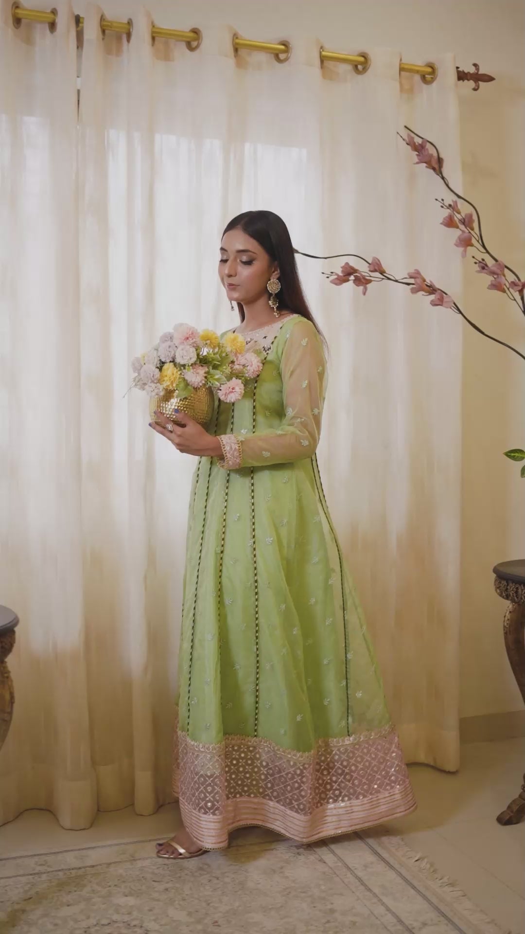 Zyra, a sage green craft that exudes sophistication and liveliness. This long dress is formed from luxurious organza, featuring meticulously designed panels that flow like water with every step. The neckline is adorned with intricate embroidery, showcasing a delicate blend of craftsmanship and artistry. Gota trims further enhance the dress, adding a touch of traditional charm that perfectly complements the modernity of it.